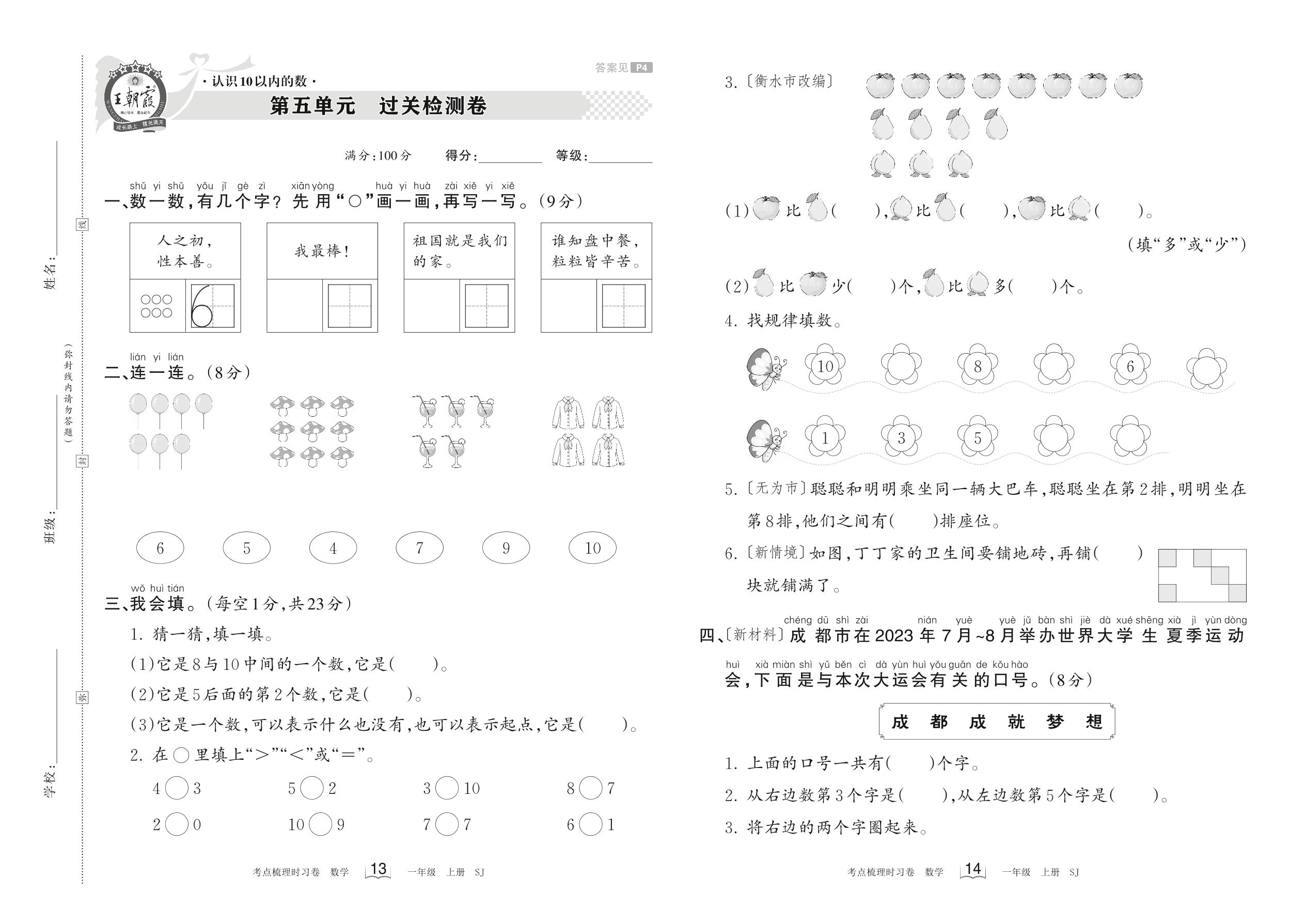 2023上册一年级数学苏教版 第五单元 过关检测卷
