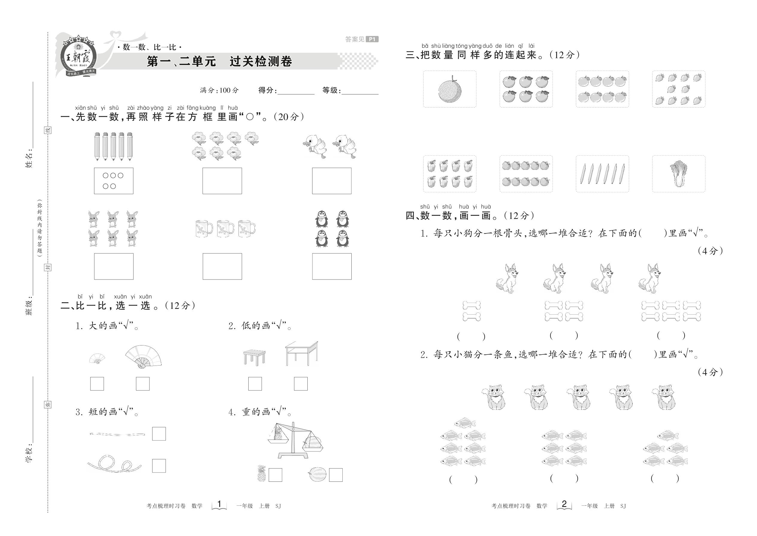 2023上册一年级数学苏教版 第一、二单元 过关检测卷