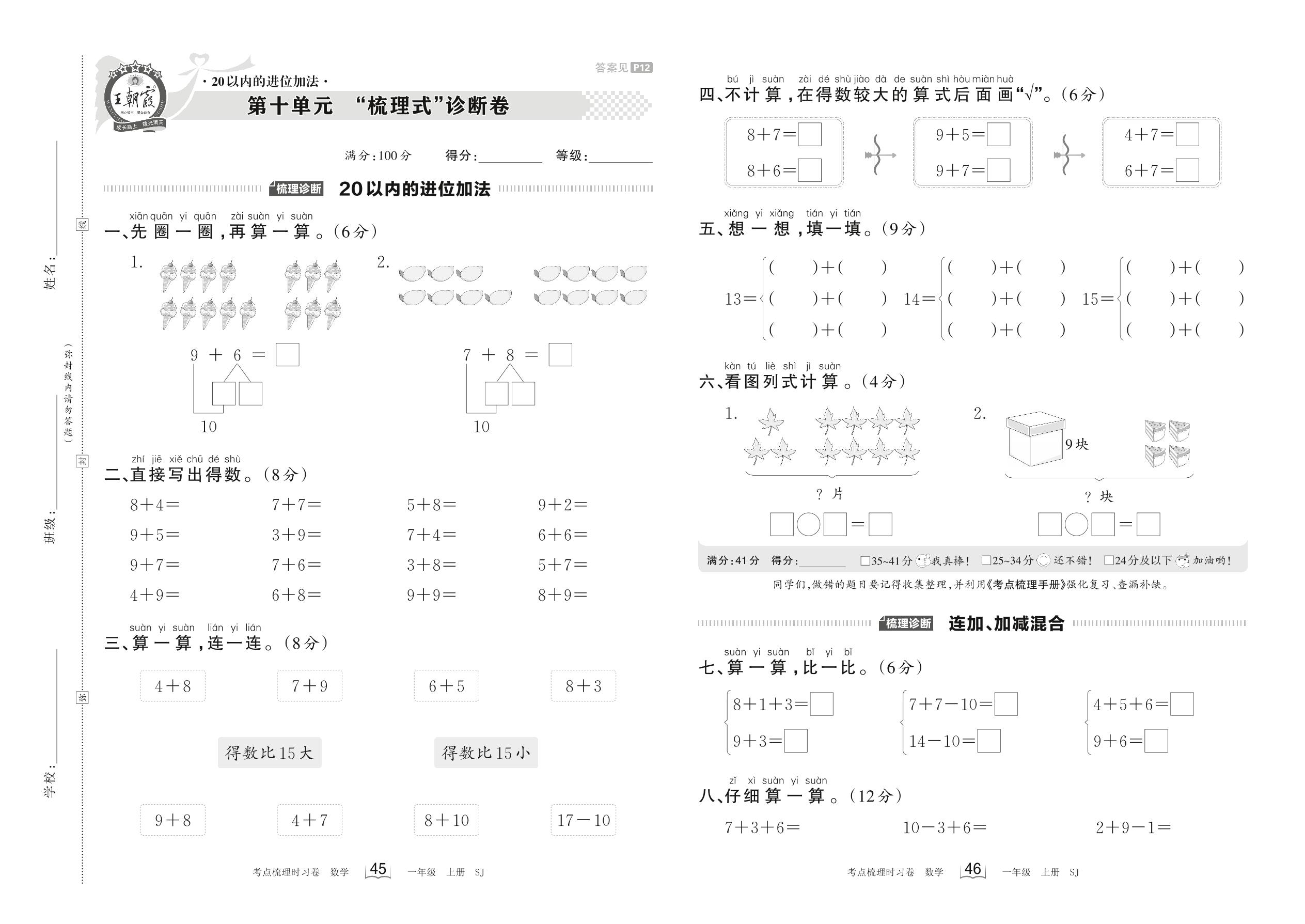 2023上册一年级数学苏教版 第十单元 “梳理式”诊断卷