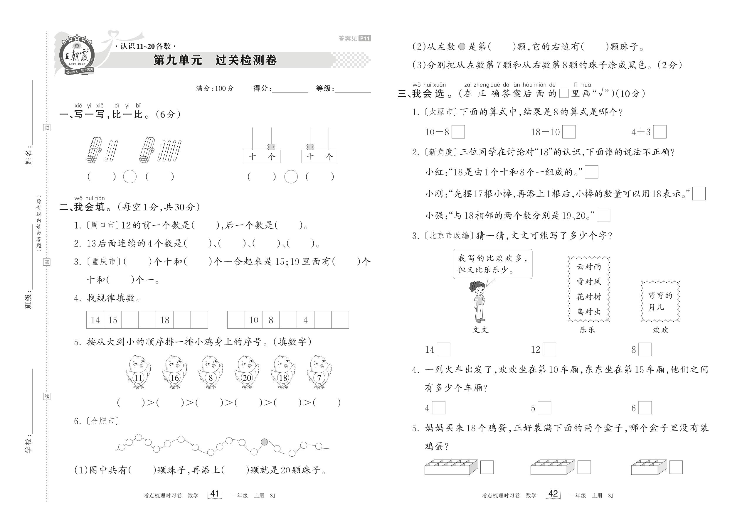 2023上册一年级数学苏教版 第九单元 过关检测卷