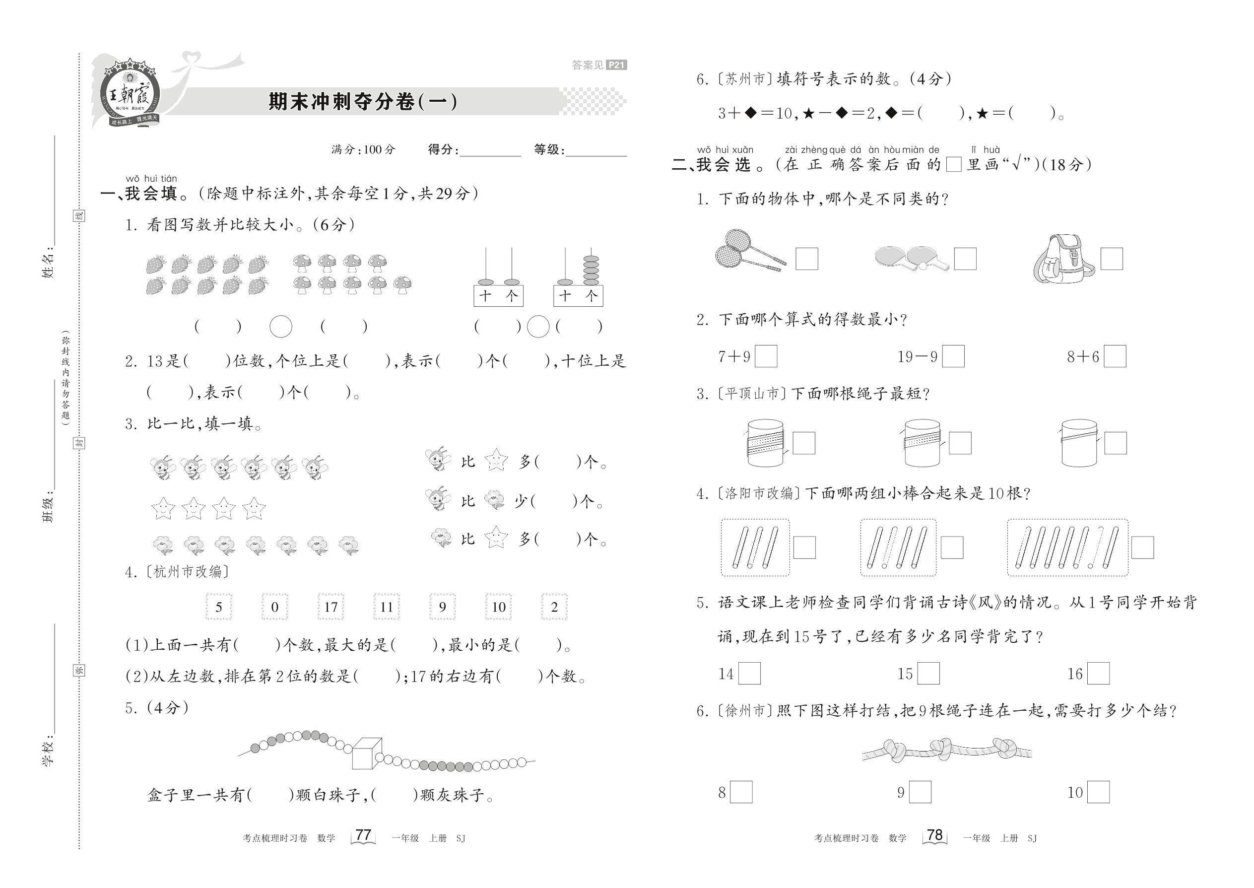 2023上册一年级数学苏教版 期末冲刺夺分卷(一)