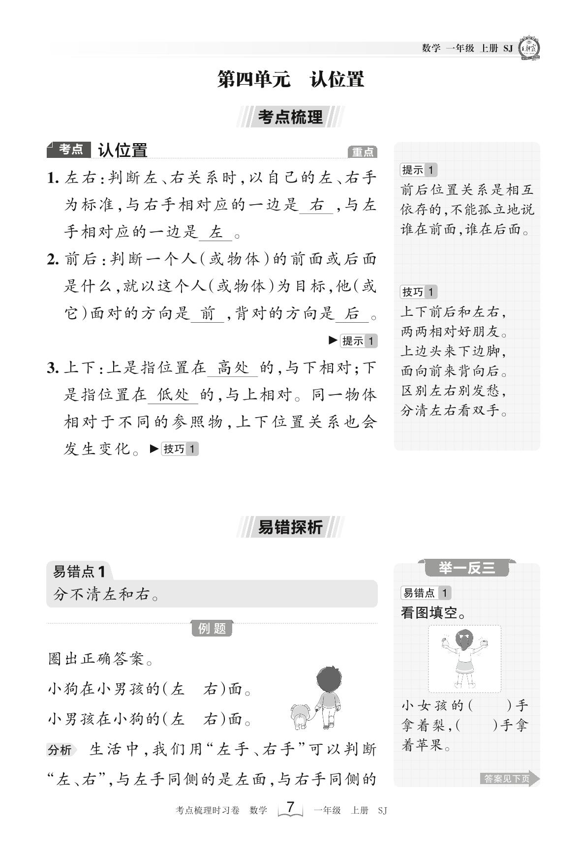 2023上册一年级数学苏教版 考点梳理手册——第四单元 认位置