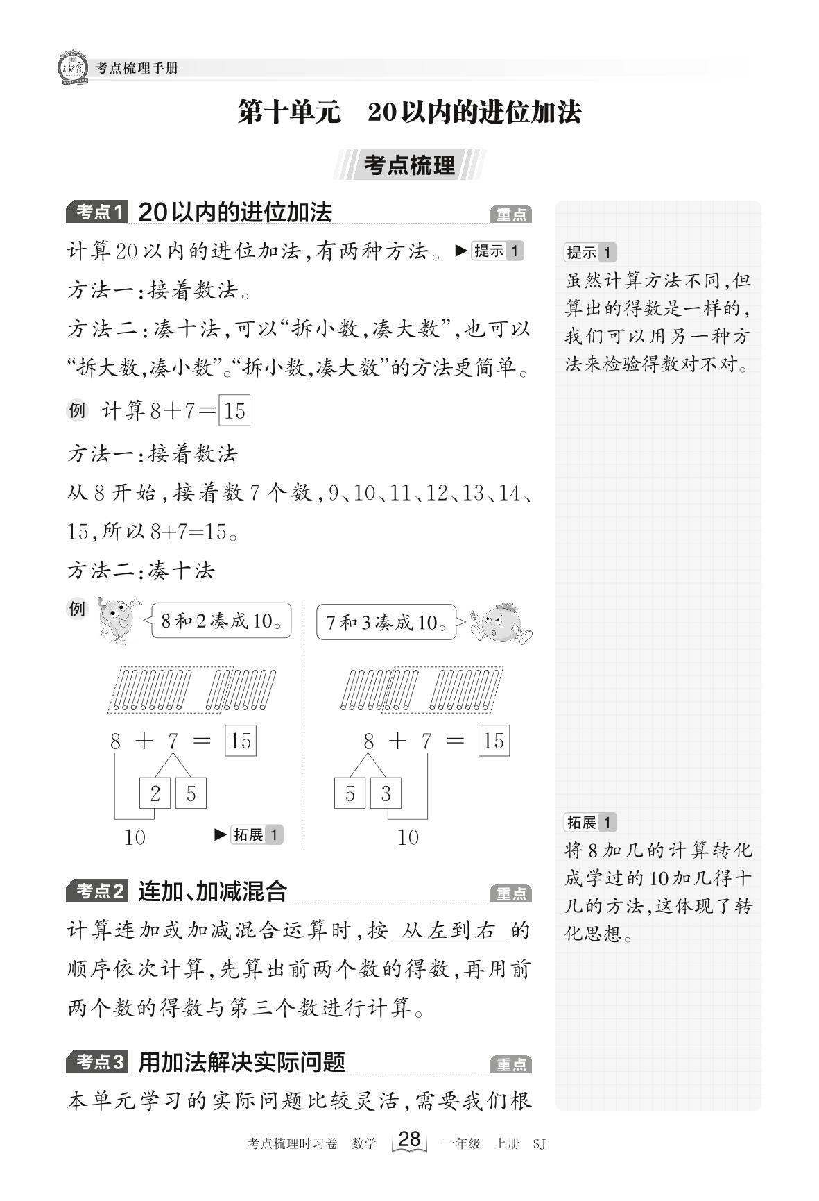 2023上册一年级数学苏教版 考点梳理手册——第十单元 20以内的进位加法