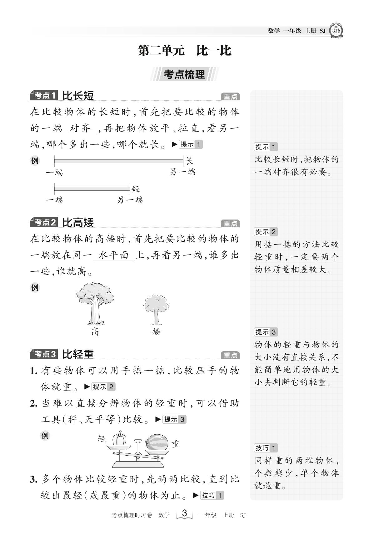 2023上册一年级数学苏教版 考点梳理手册——第二单元 比一比