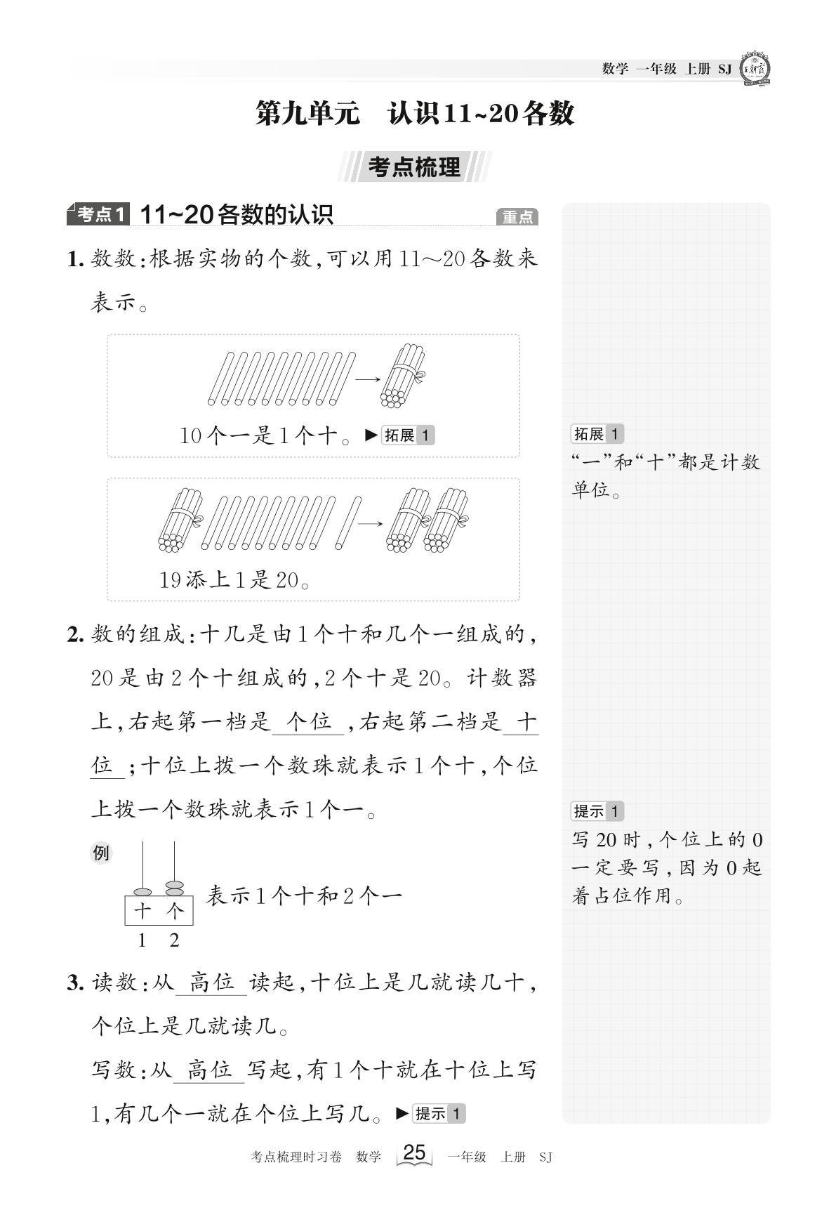 2023上册一年级数学苏教版 考点梳理手册——第九单元 认识11~20各数
