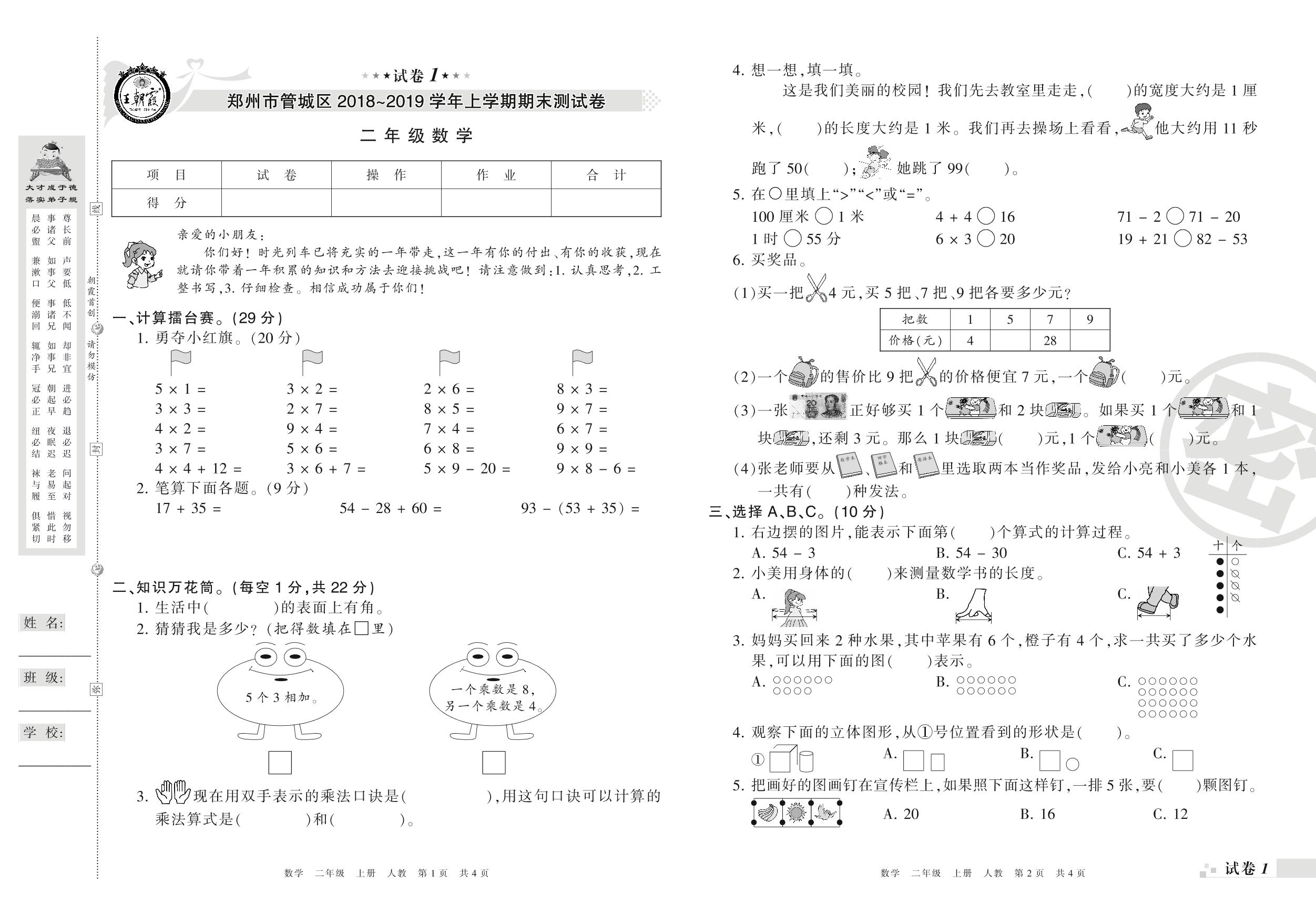 2018-2019学年第一学期郑州市管城区二年级数学试卷(人教版)【1】
