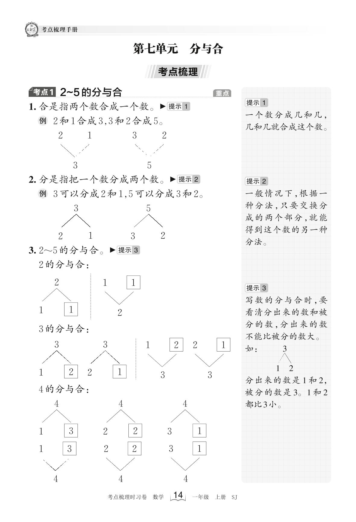 2023上册一年级数学苏教版 考点梳理手册——第七单元 分与合