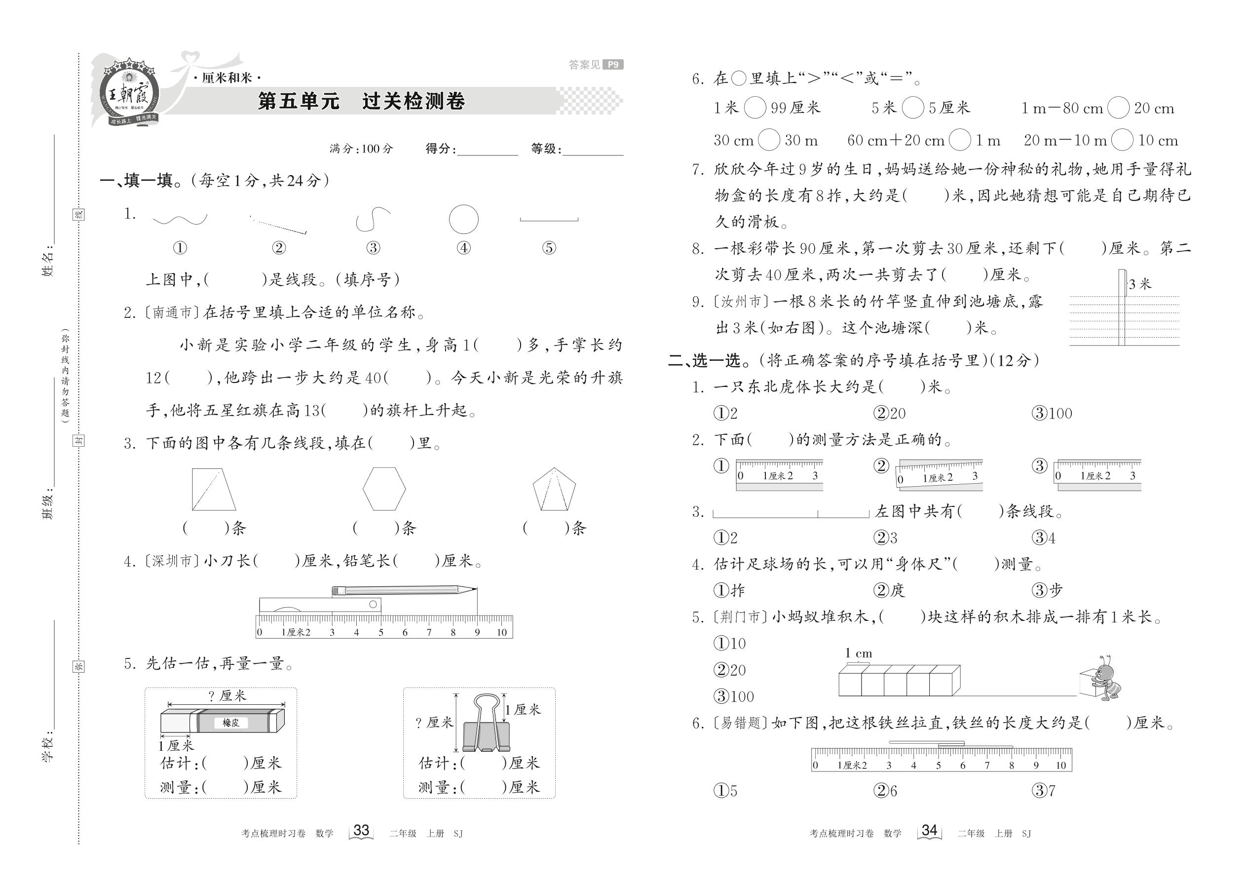 2023上册二年级数学苏教版 第五单元 过关检测卷