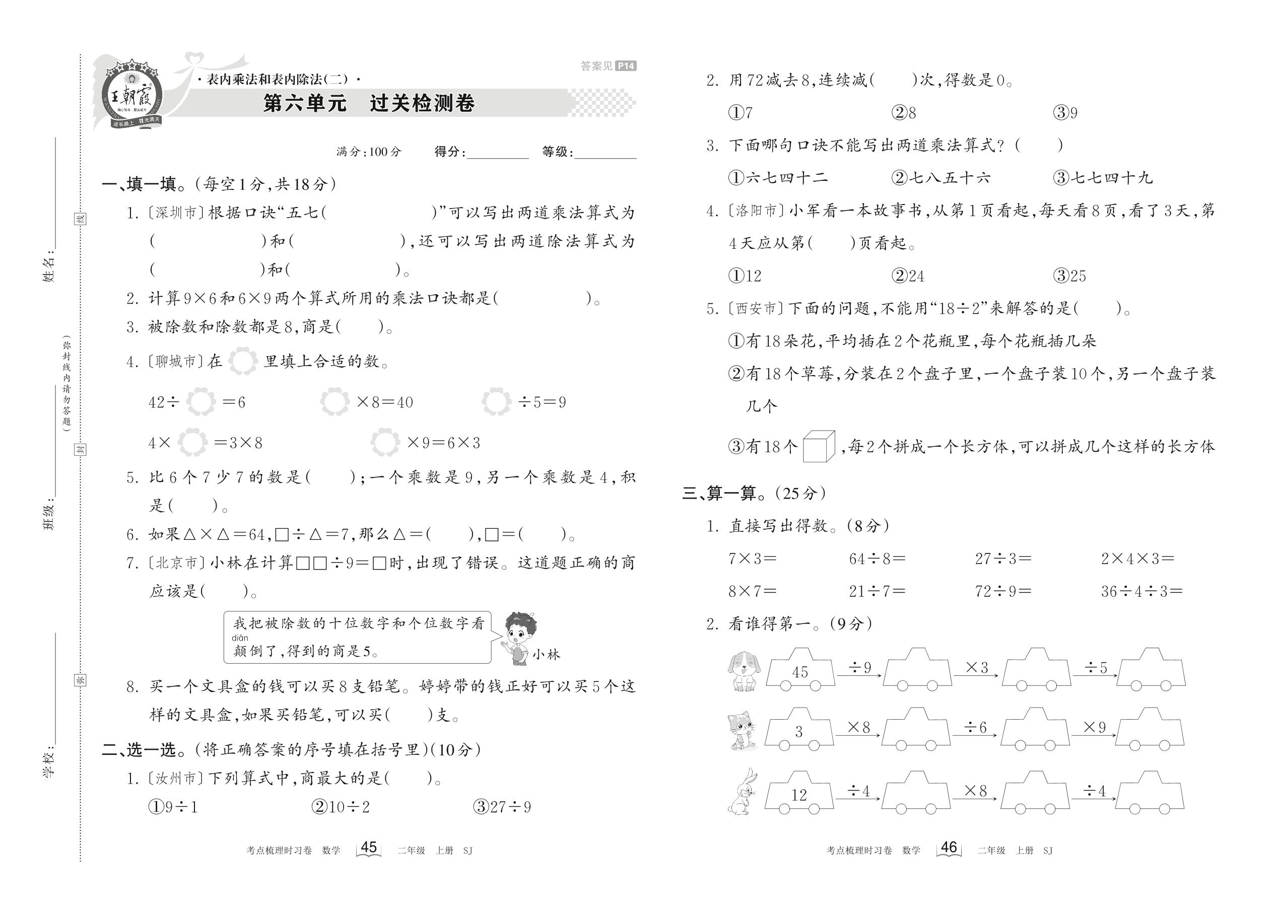 2023上册二年级数学苏教版 第六单元 过关检测卷