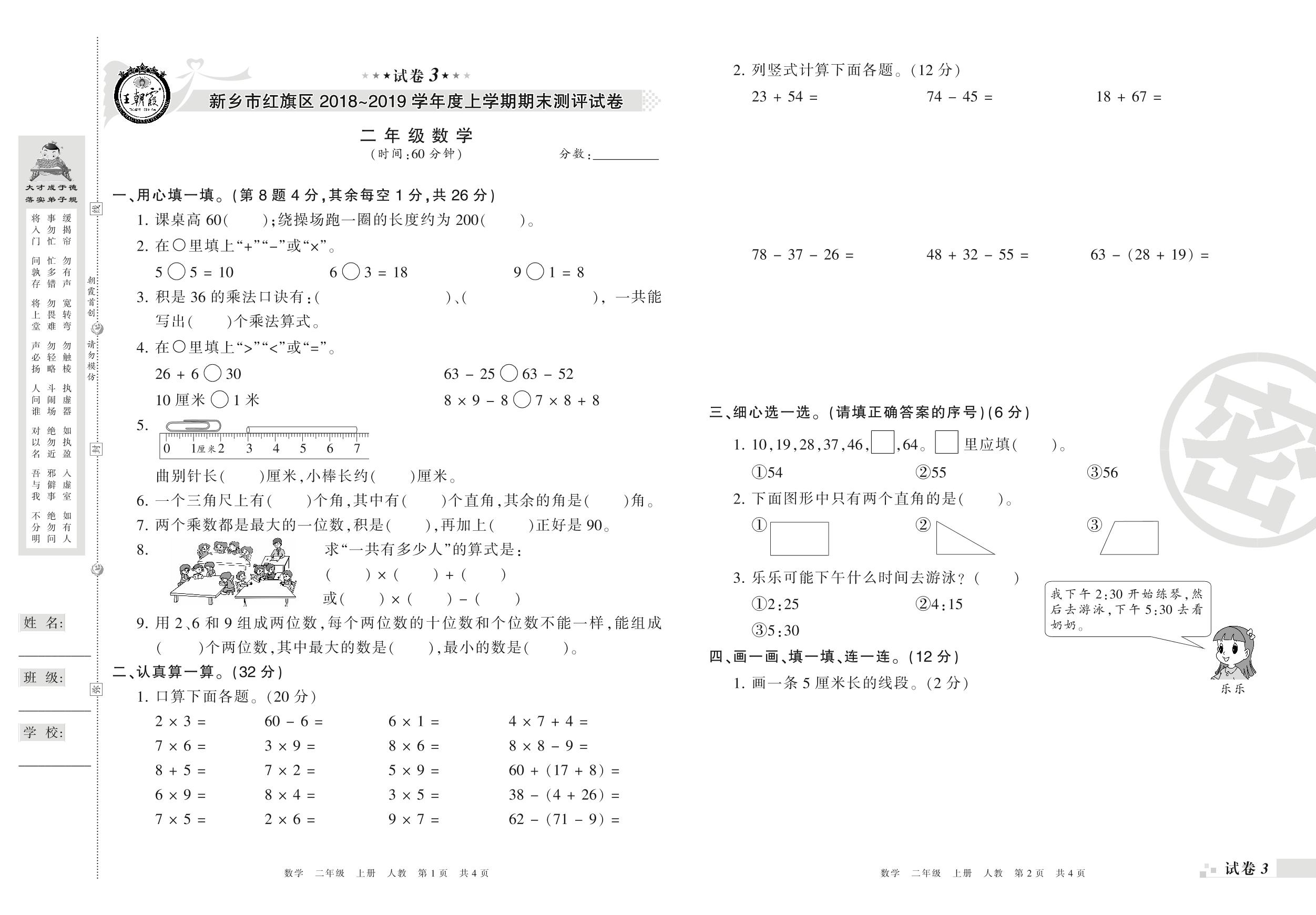 2018-2019学年第一学期新乡市红旗区二年级数学试卷(人教版)【3】