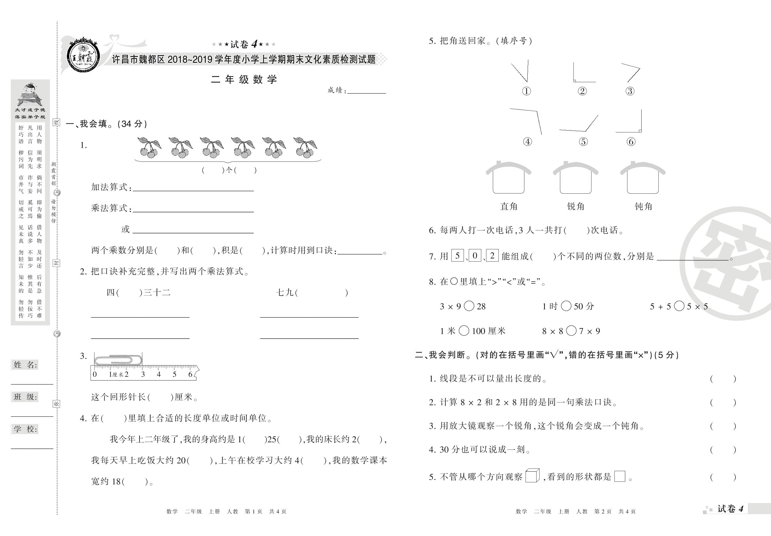 2018-2019学年第一学期许昌市魏都区二年级数学试卷(人教版)【4】