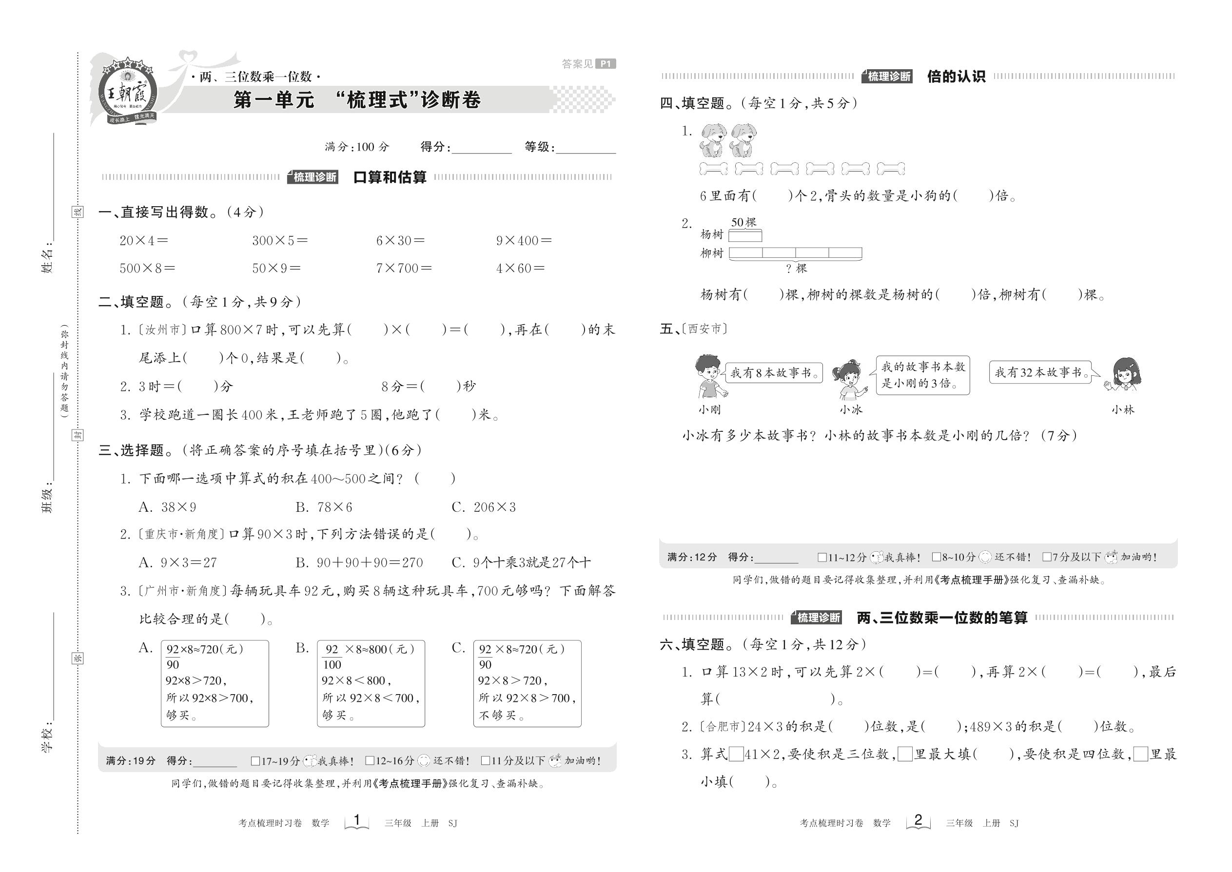 2023上册三年级数学苏教版 第一单元 “梳理式”诊断卷