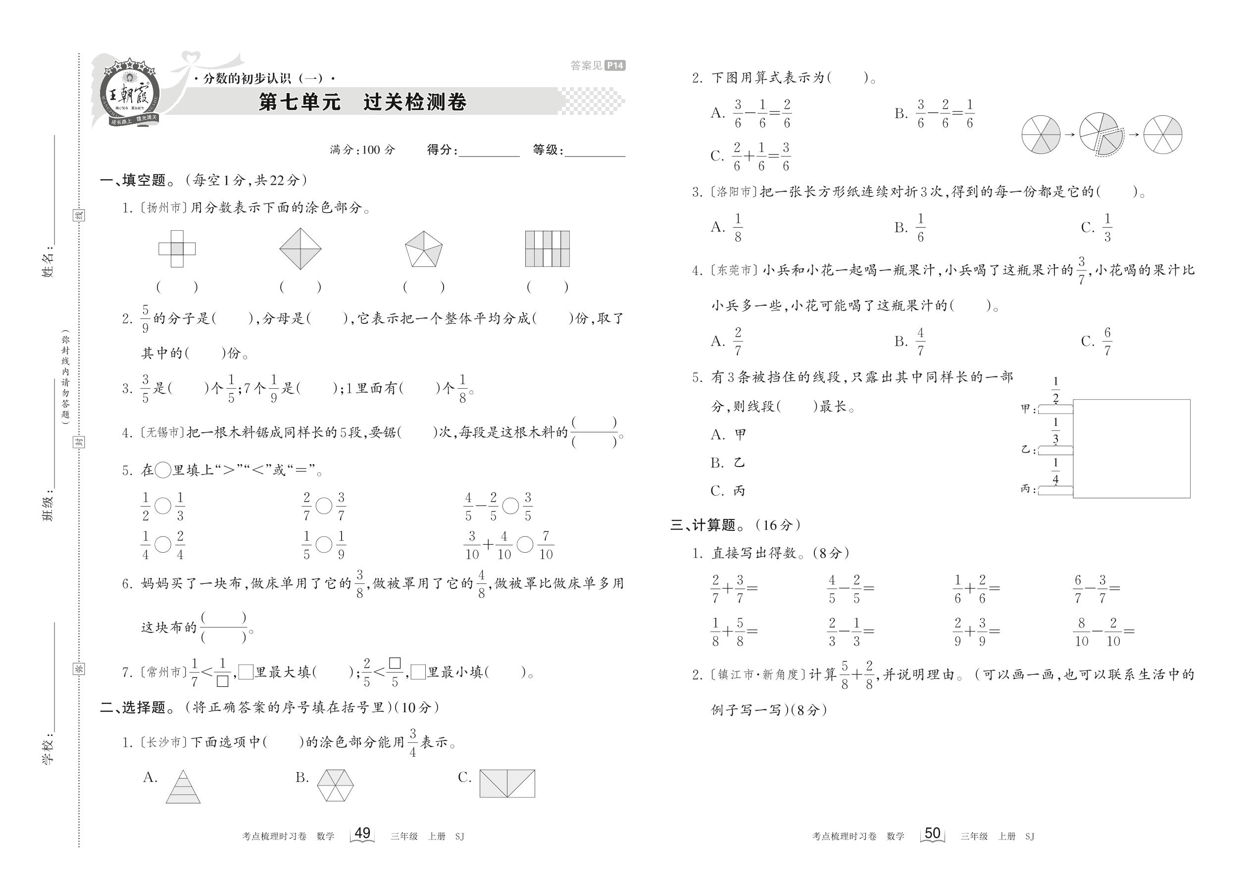 2023上册三年级数学苏教版 第七单元 过关检测卷