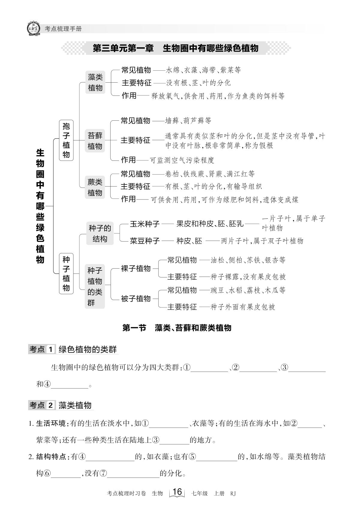 2023上册七年级生物人教版 考点梳理手册——第三单元第一章 生物圈中有哪些绿色植物
