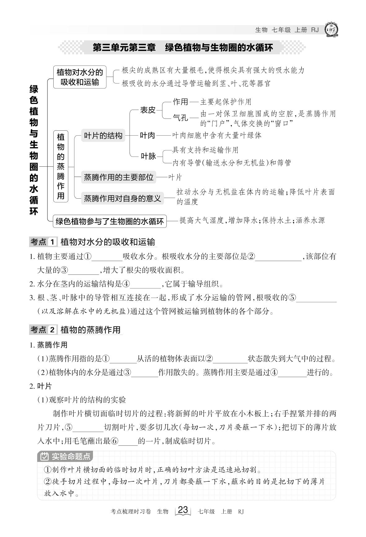 2023上册七年级生物人教版 考点梳理手册——第三单元第三章 绿色植物与生物圈的水循环