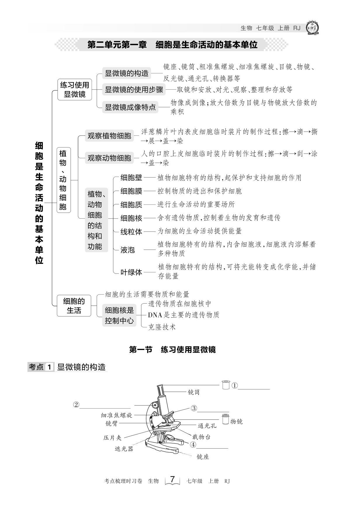 2023上册七年级生物人教版 考点梳理手册——第二单元第一章 细胞是生命活动的基本单位
