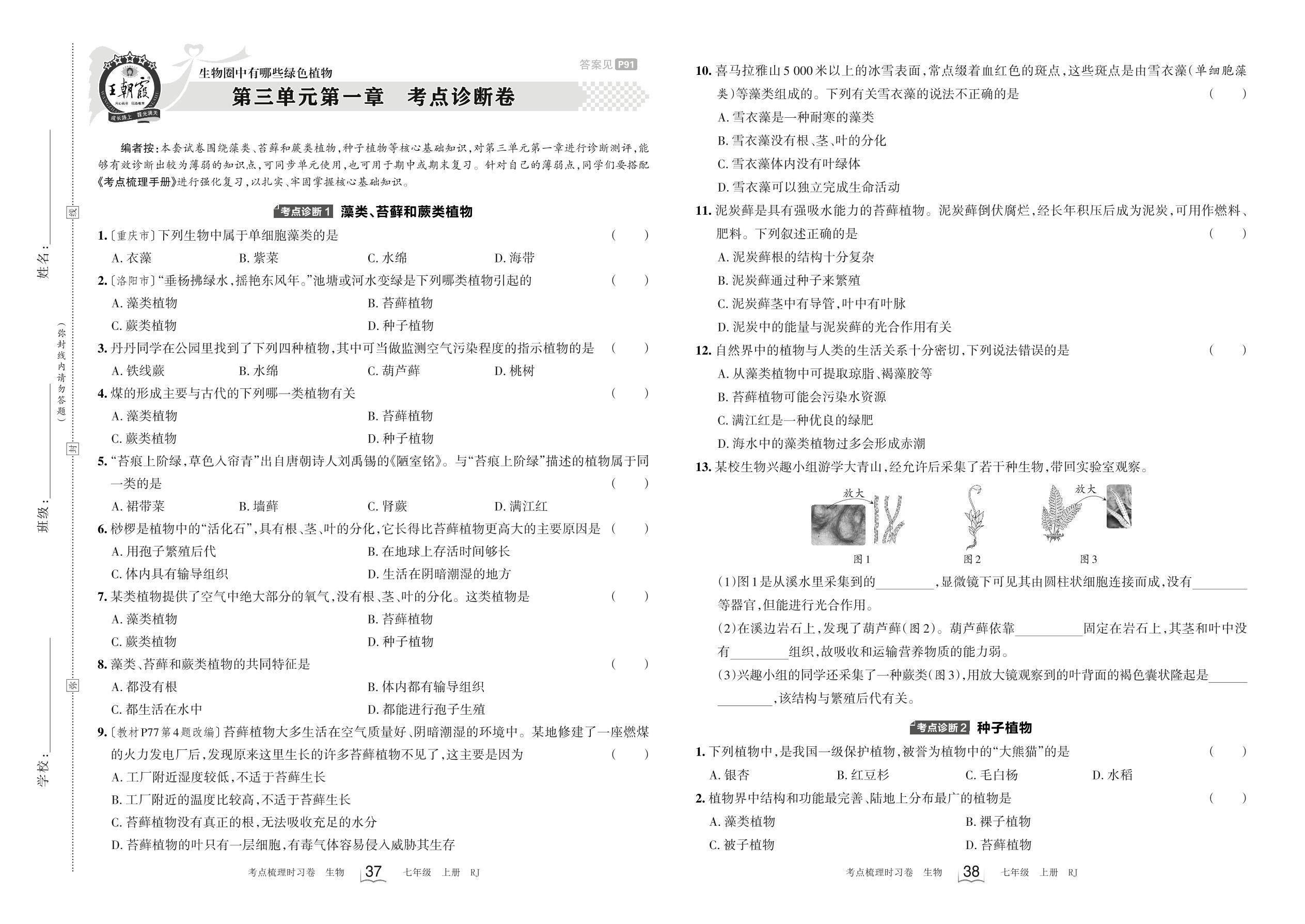 2023上册七年级生物人教版 第三单元第一章 考点诊断卷
