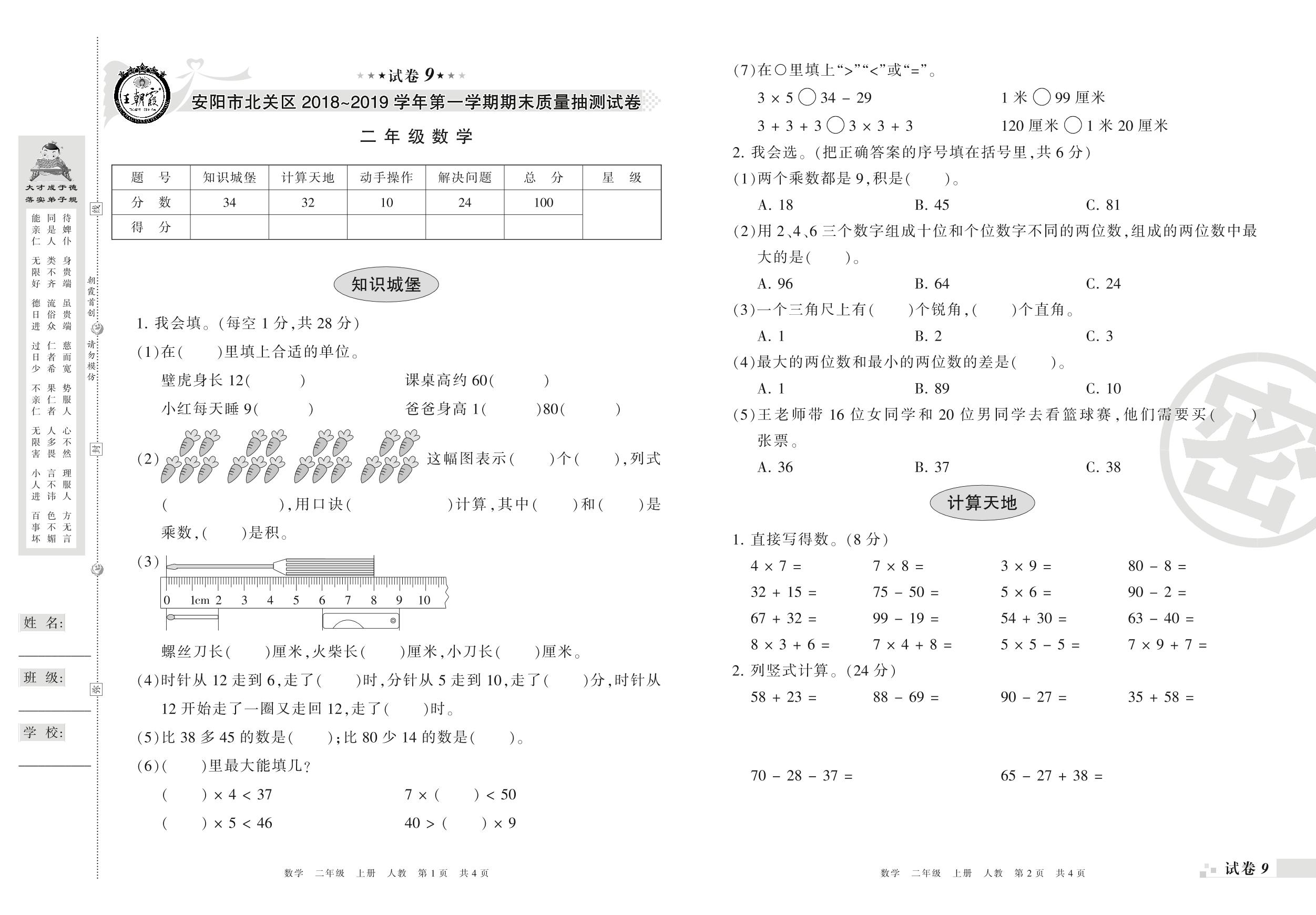 2018-2019学年第一学期安阳市北关区二年级数学试卷(人教版)【9】