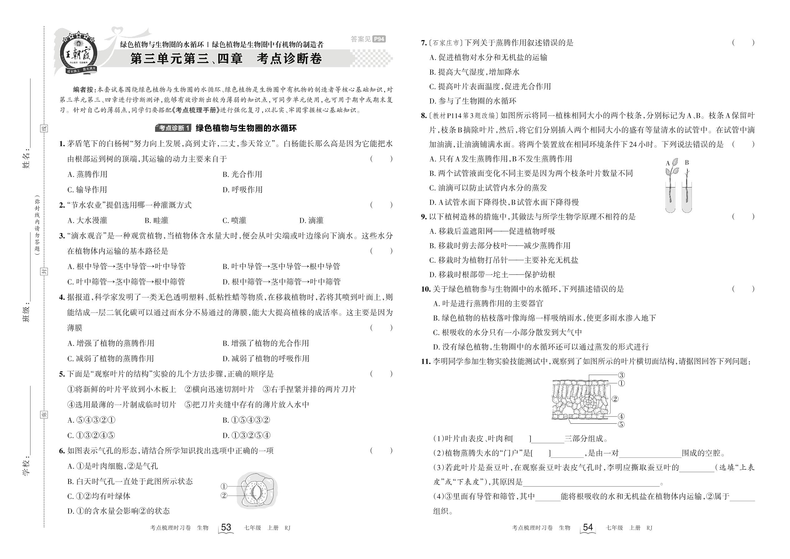 2023上册七年级生物人教版 第三单元第三、四章 考点诊断卷