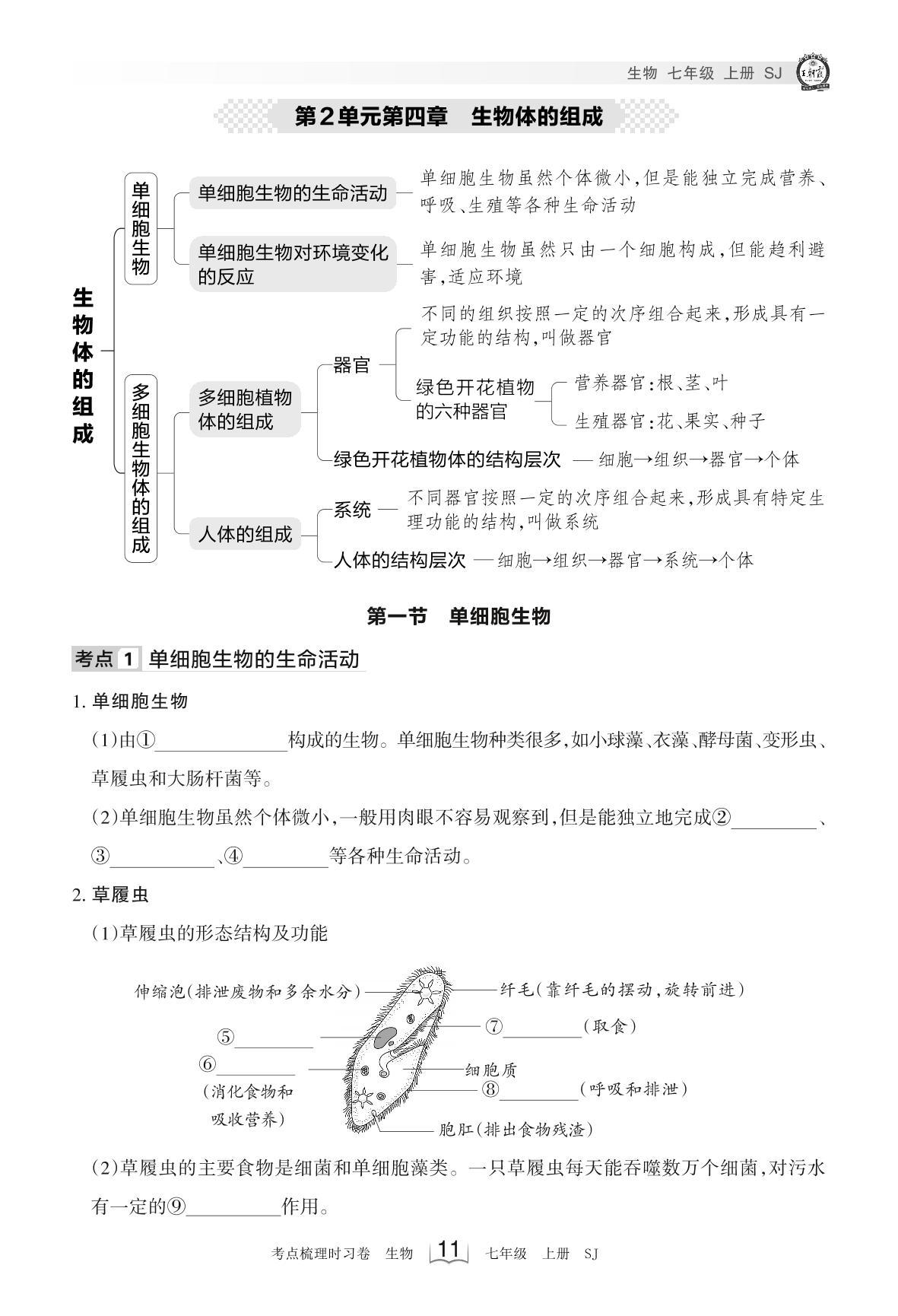2023上册七年级生物苏教版 考点梳理手册——第2单元第四章 生物体的组成