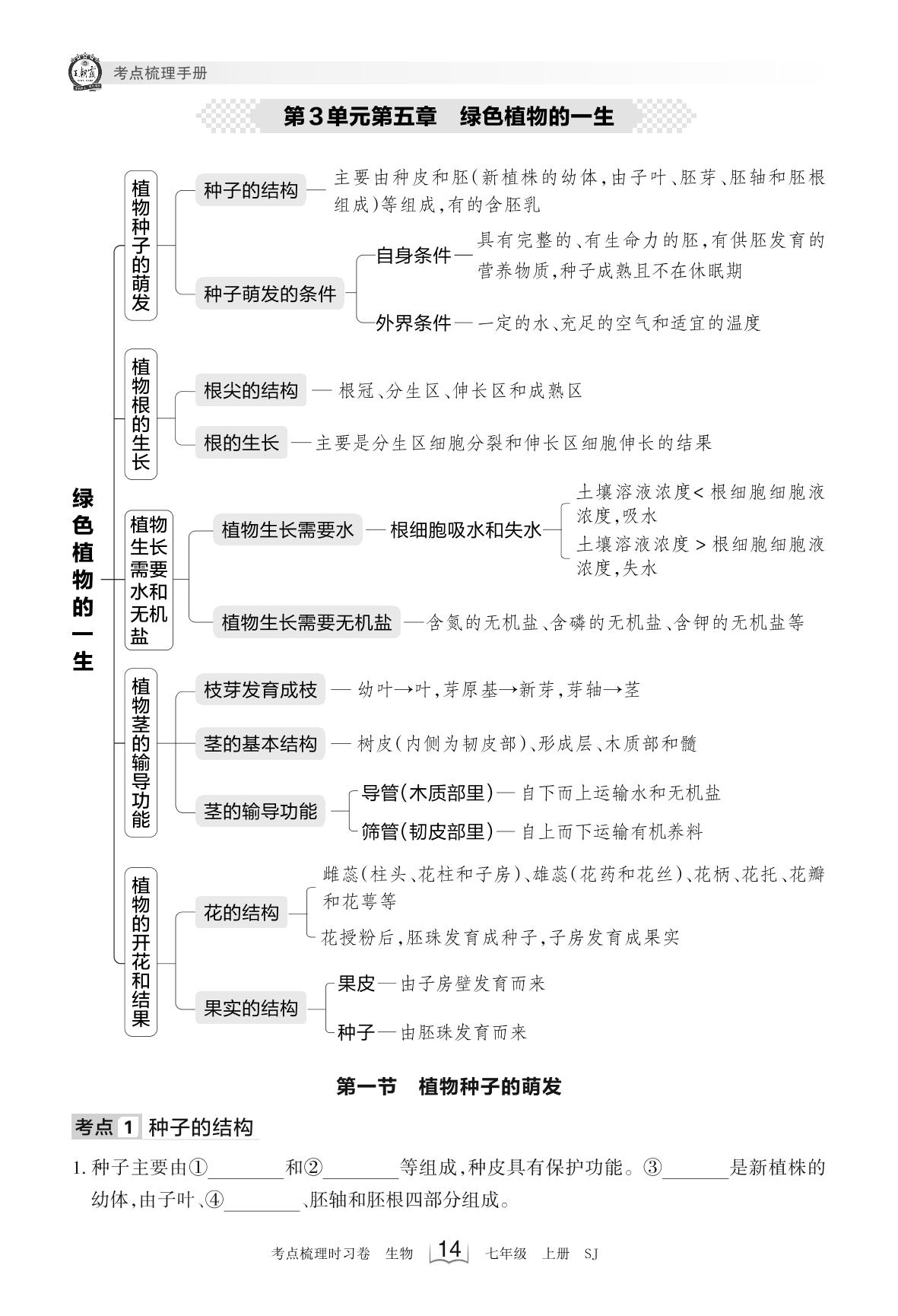 2023上册七年级生物苏教版 考点梳理手册——第3单元第五章 绿色植物的一生