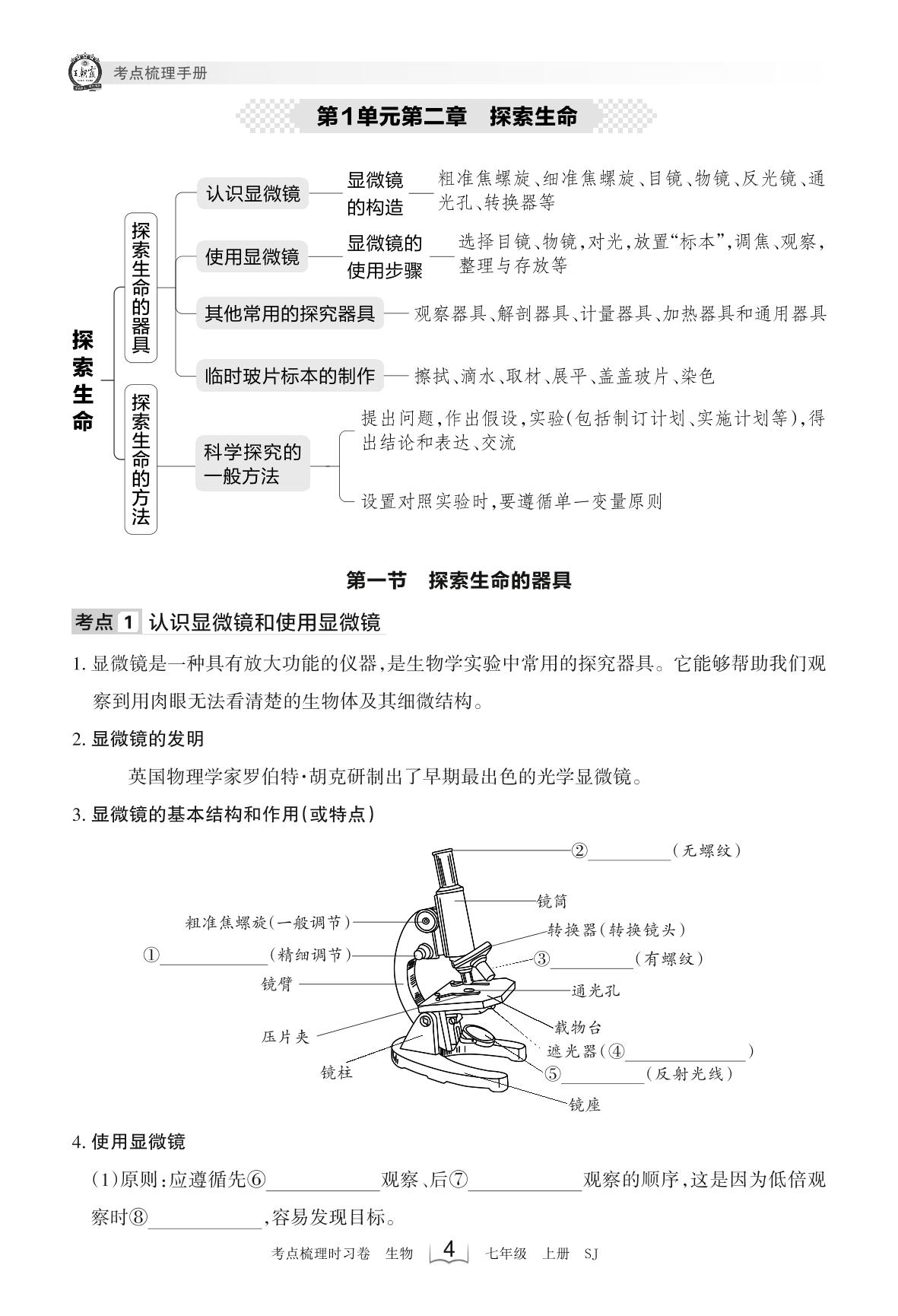 2023上册七年级生物苏教版 考点梳理手册——第1单元第二章 探索生命