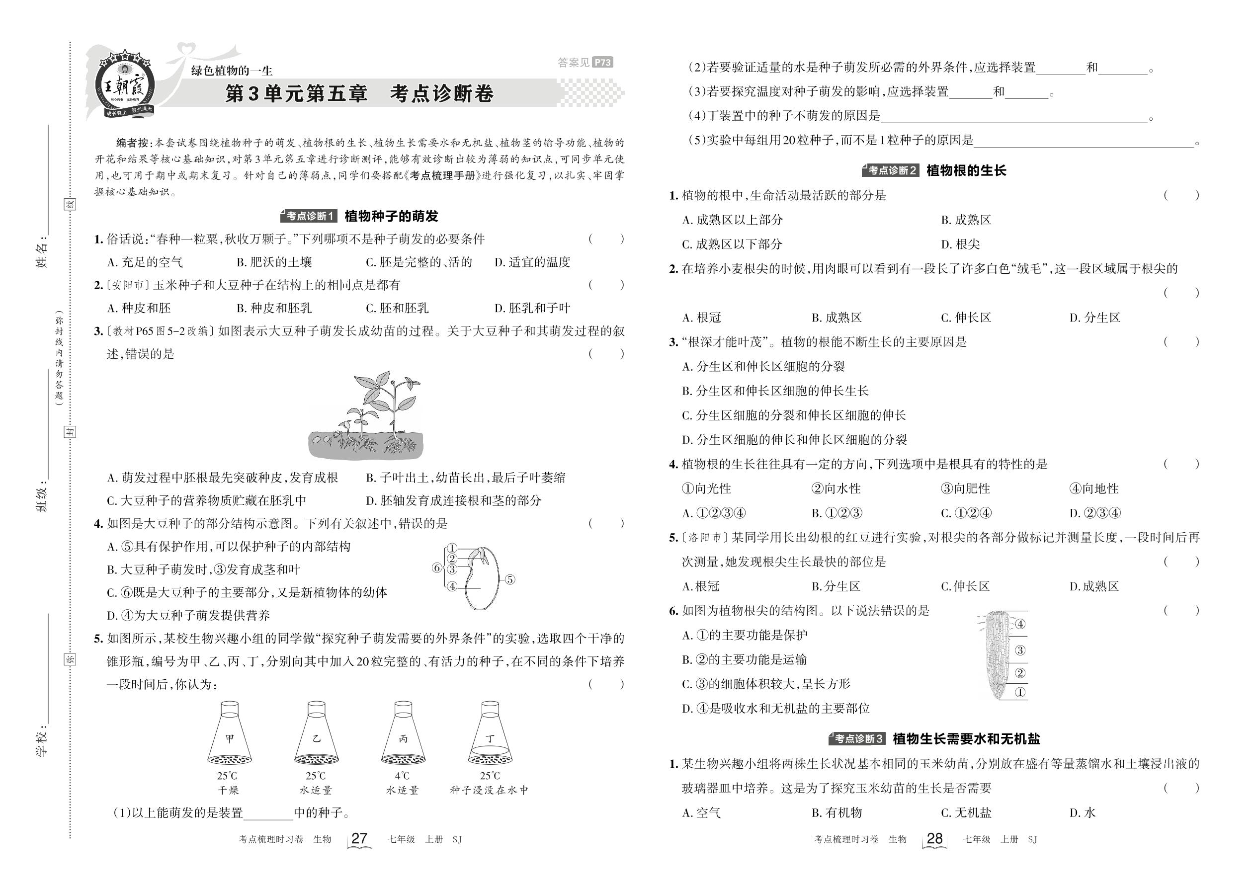 2023上册七年级生物苏教版 第3单元第五章 考点诊断卷