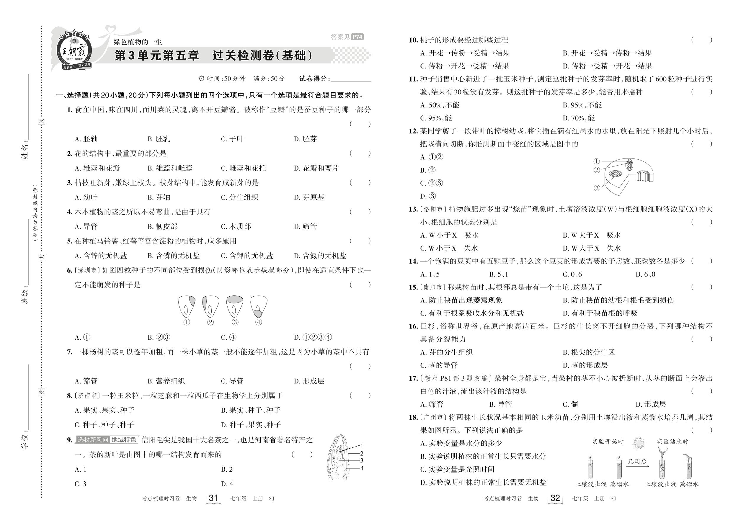 2023上册七年级生物苏教版 第3单元第五章 过关检测卷(基础)