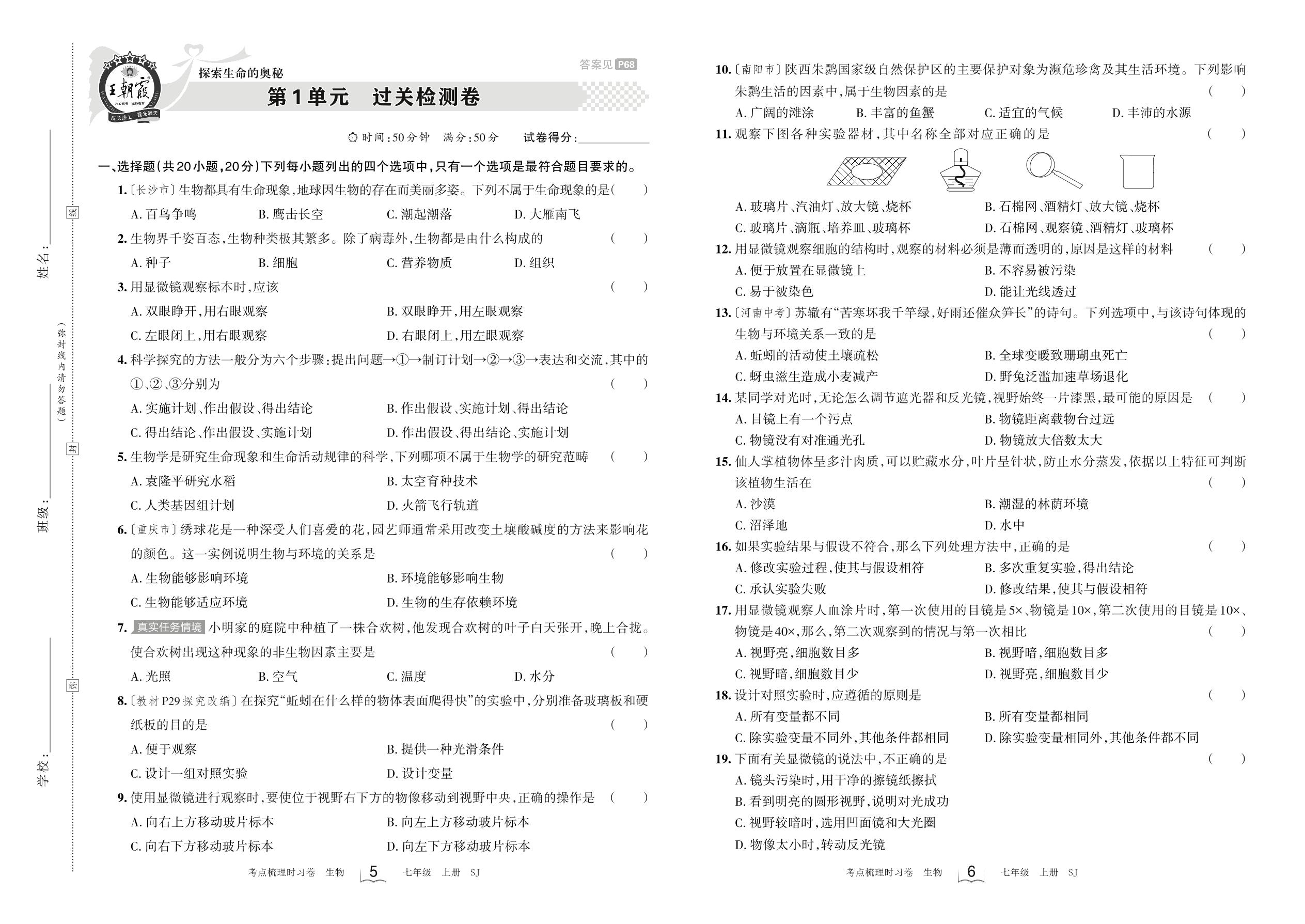 2023上册七年级生物苏教版 第1单元 过关检测卷