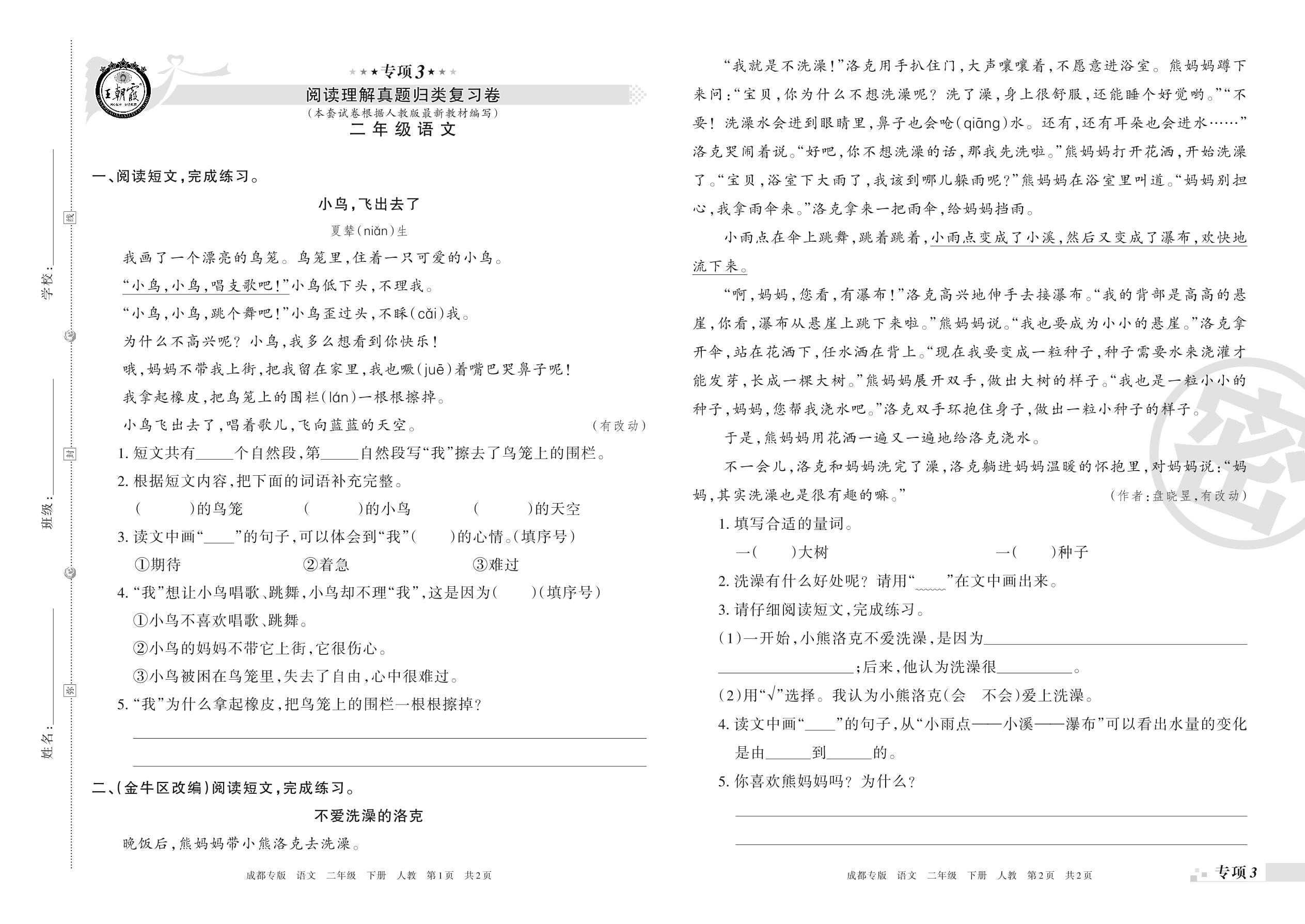 王朝霞期末专项卷——阅读理解、写话真题归类复习二年级下册语文(人教版)_R21080163106【0】