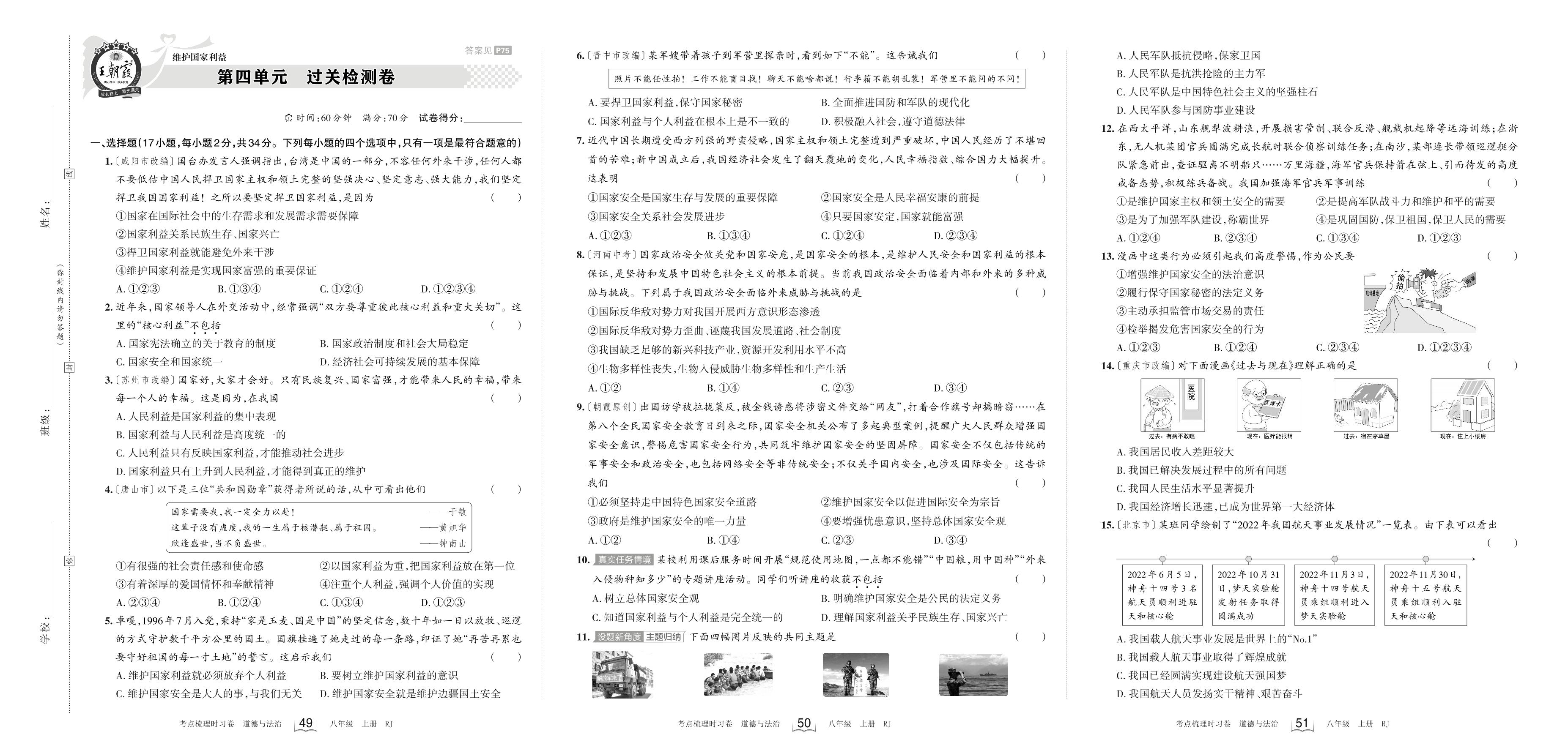 2023上册八年级道德与法治人教版 第四单元 过关检测卷