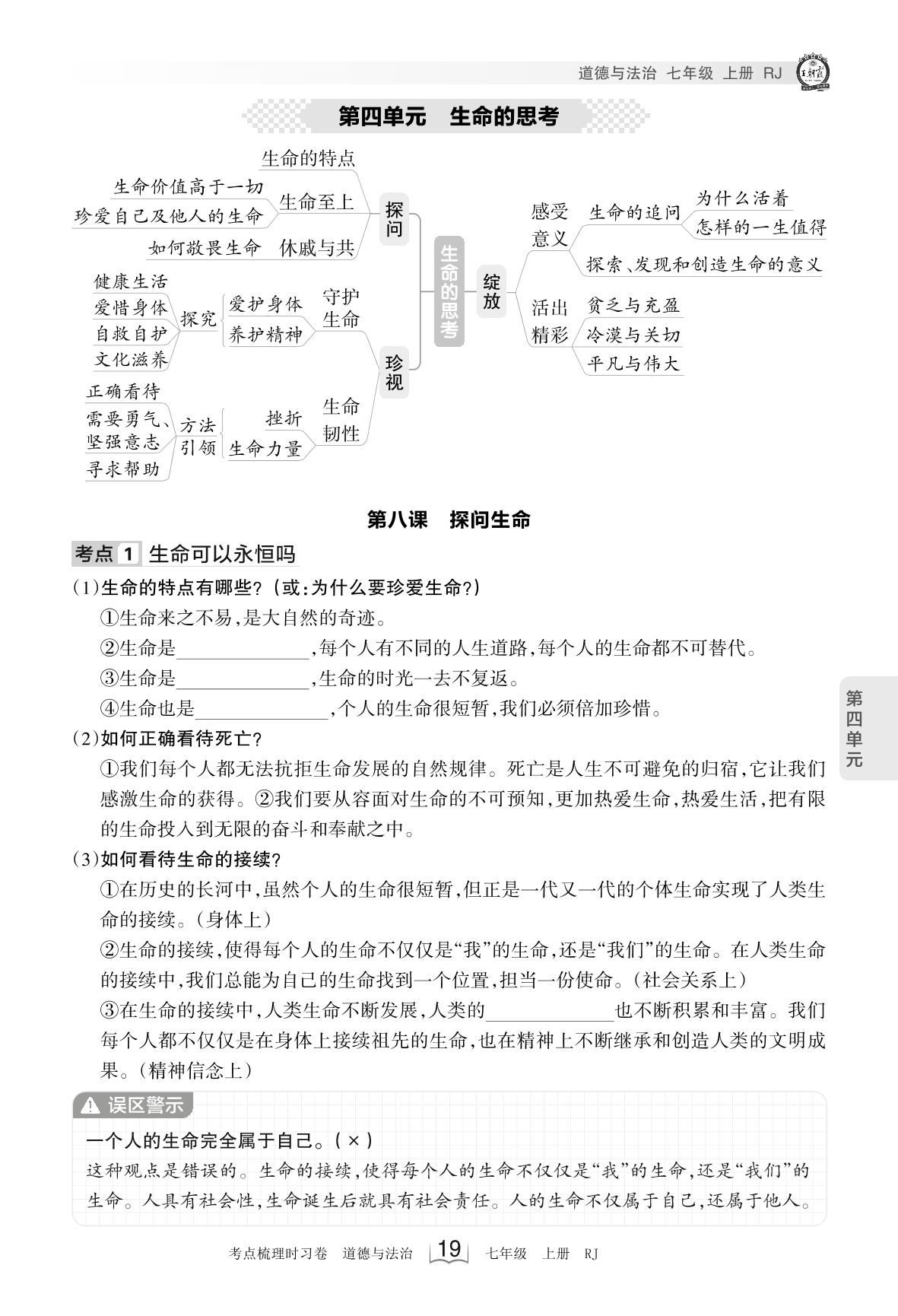 2023上册七年级道德与法治人教版 考点梳理手册——第四单元 生命的思考