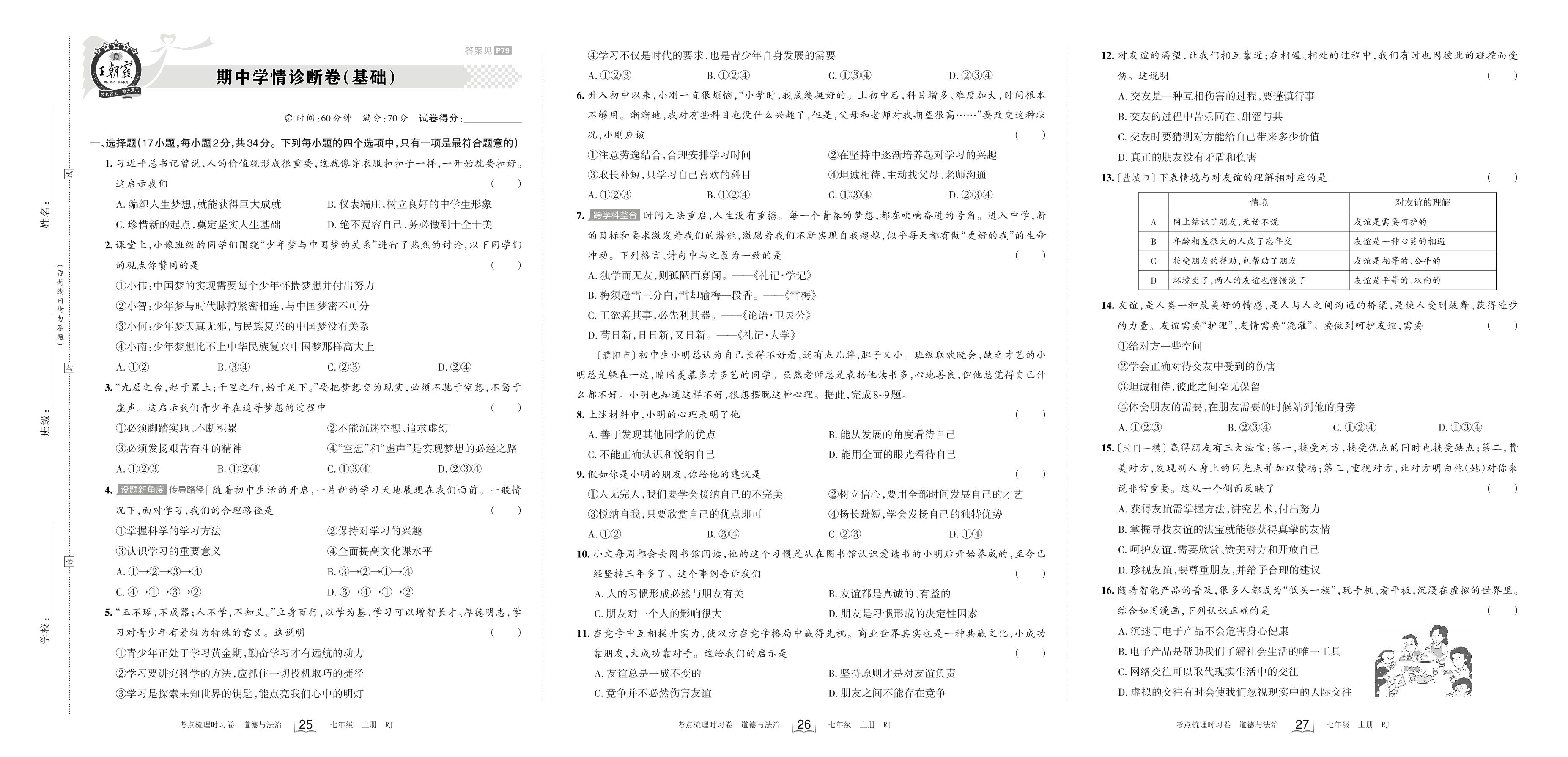 2023上册七年级道德与法治人教版 期中学情诊断卷(基础)