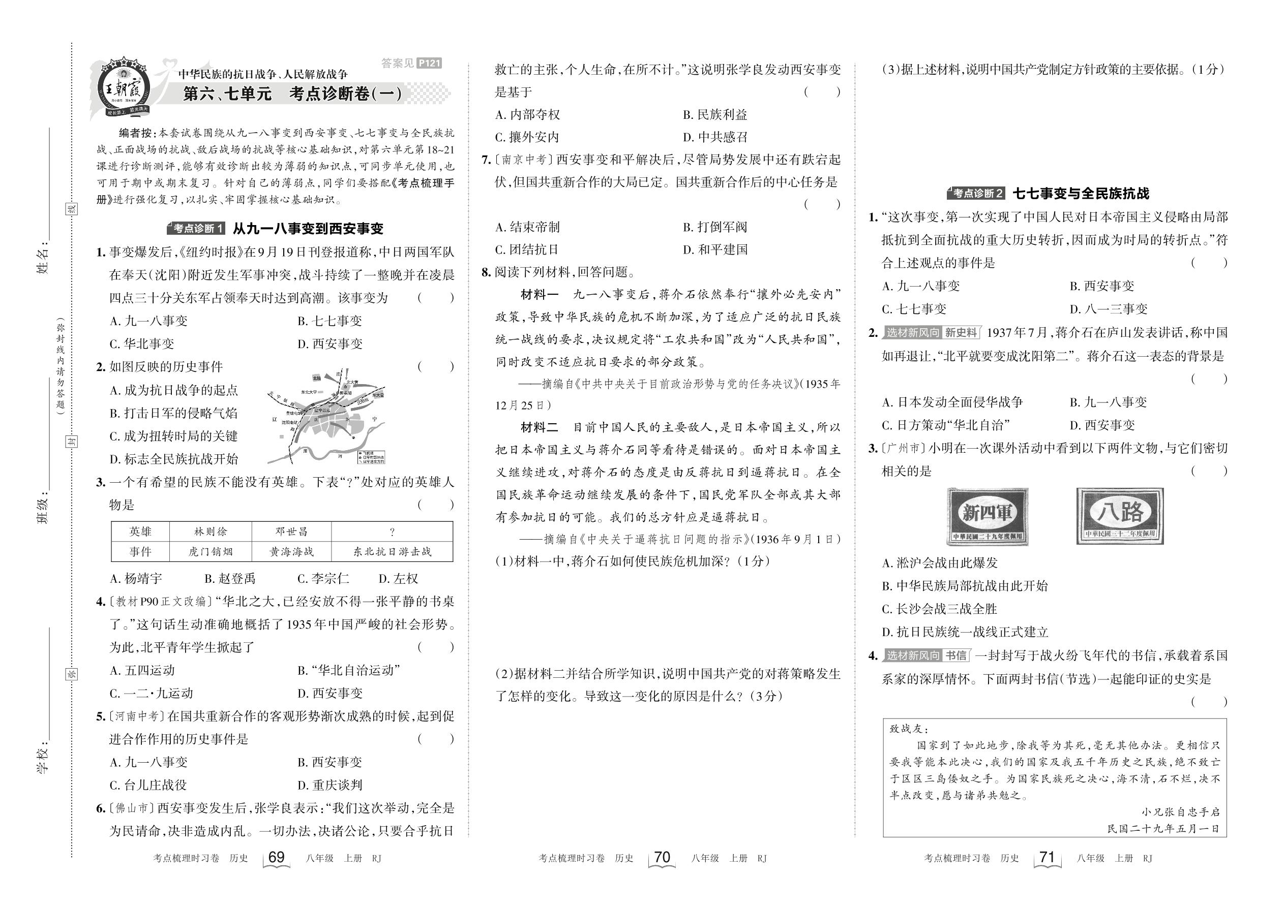 2023上册八年级历史人教版 第六、七单元 考点诊断卷(一)