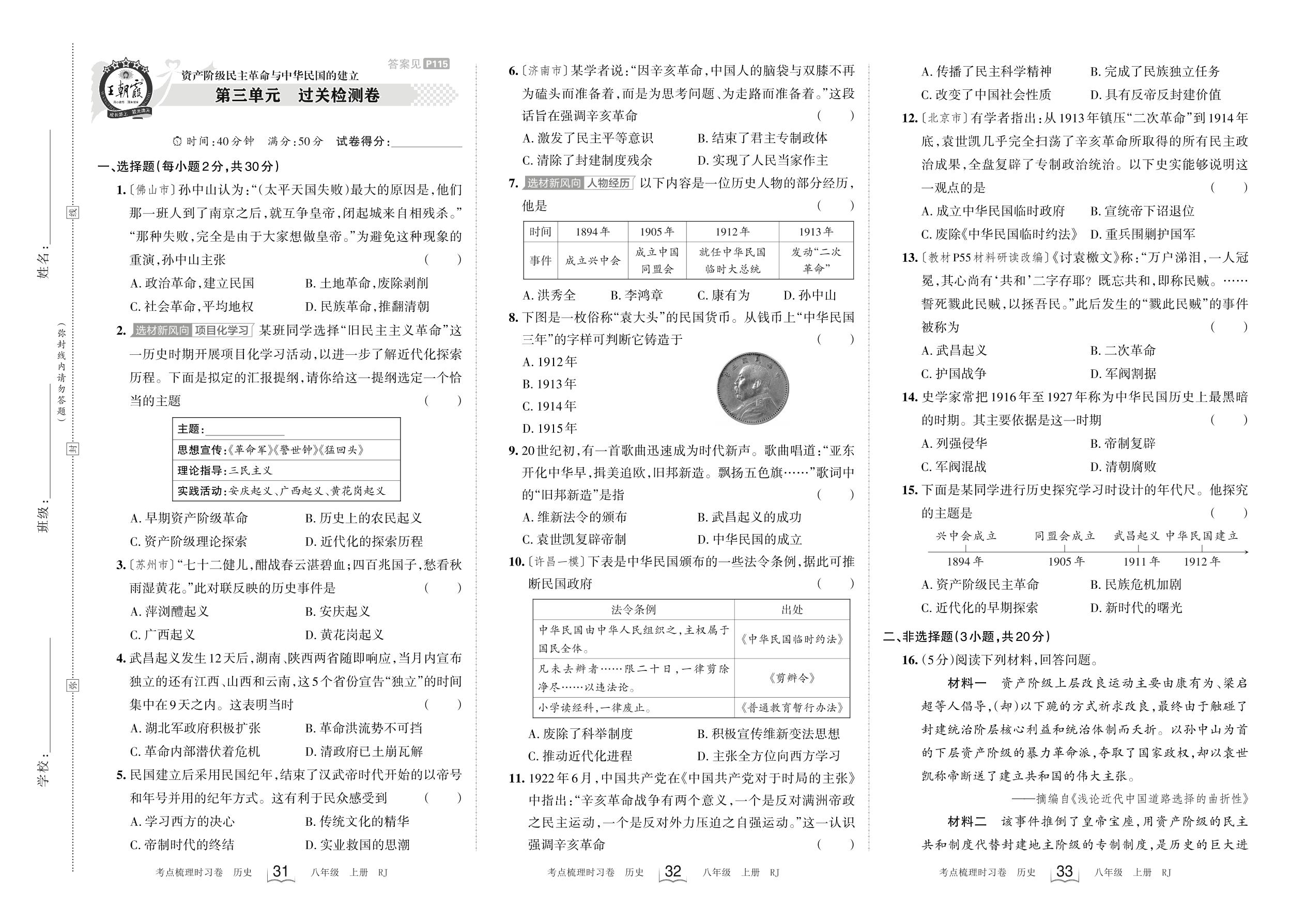2023上册八年级历史人教版 第三单元 过关检测卷