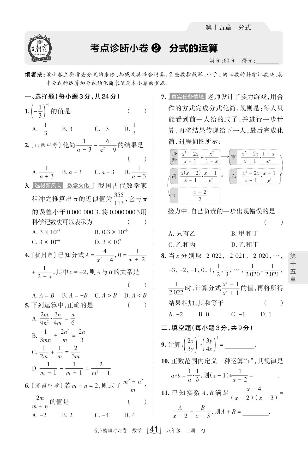 2023上册八年级数学人教版 考点诊断小卷2 分式的运算