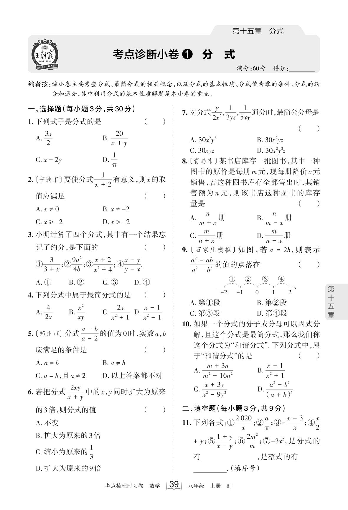 2023上册八年级数学人教版 考点诊断小卷1 分式