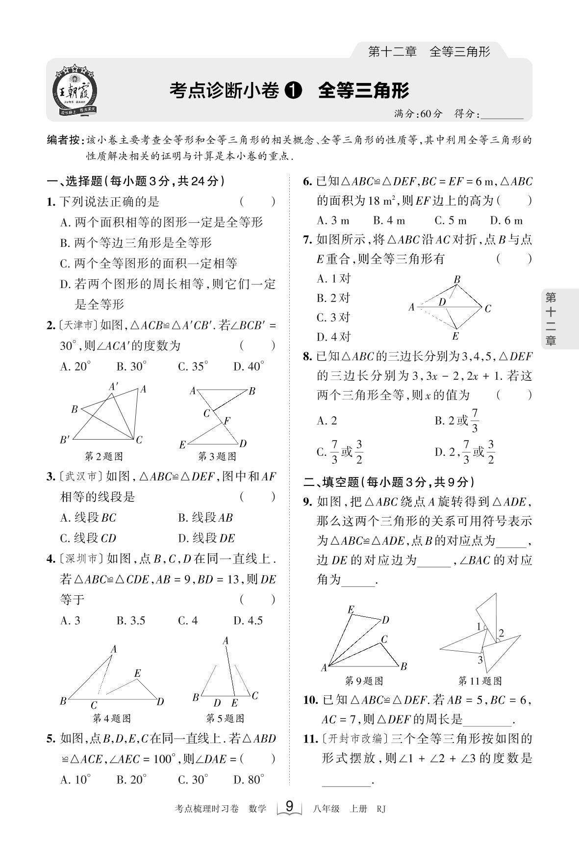2023上册八年级数学人教版 考点诊断小卷1 全等三角形