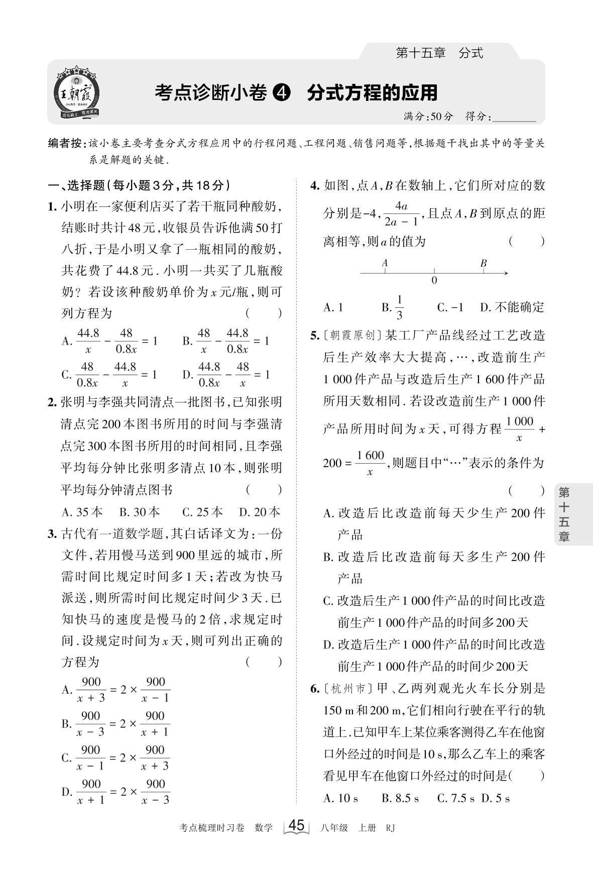 2023上册八年级数学人教版 考点诊断小卷4 分式方程的应用
