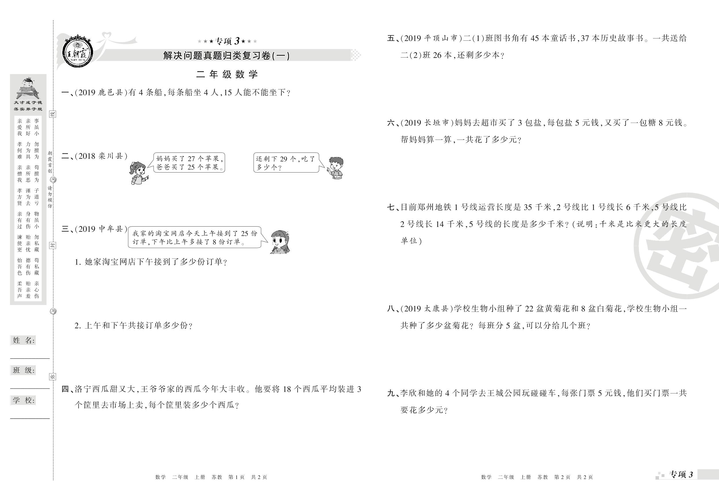 王朝霞期末专项卷——解决问题真题归类复习二年级上册数学(苏教版)_R21080393443【0】