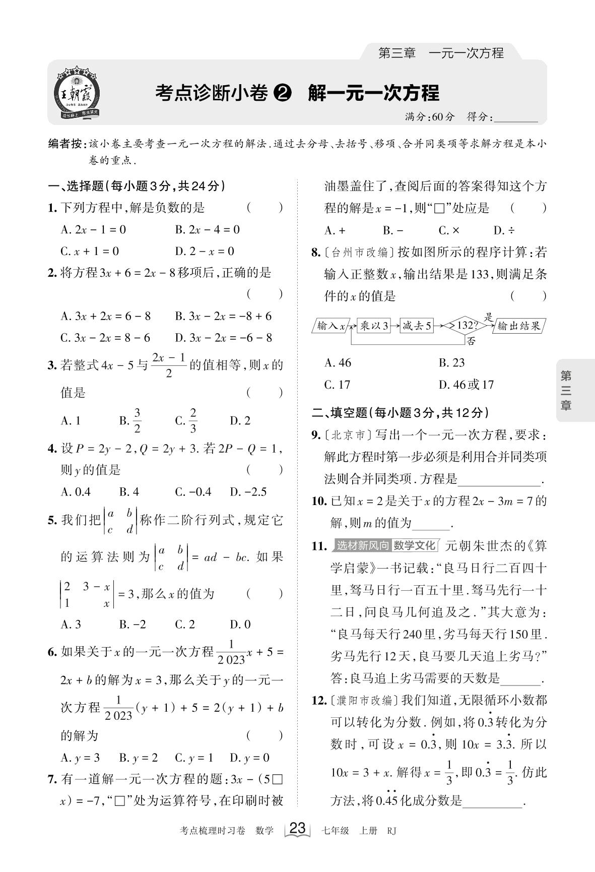 2023上册七年级数学人教版 考点诊断小卷2 解一元一次方程