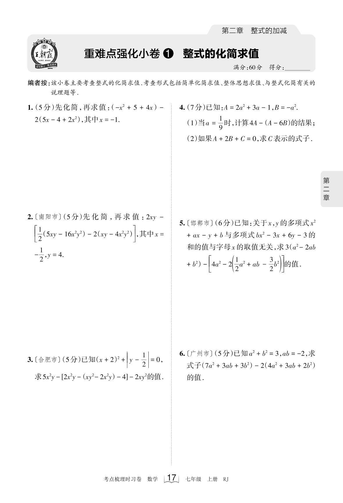 2023上册七年级数学人教版 重难点强化小卷1 整式的化简求值