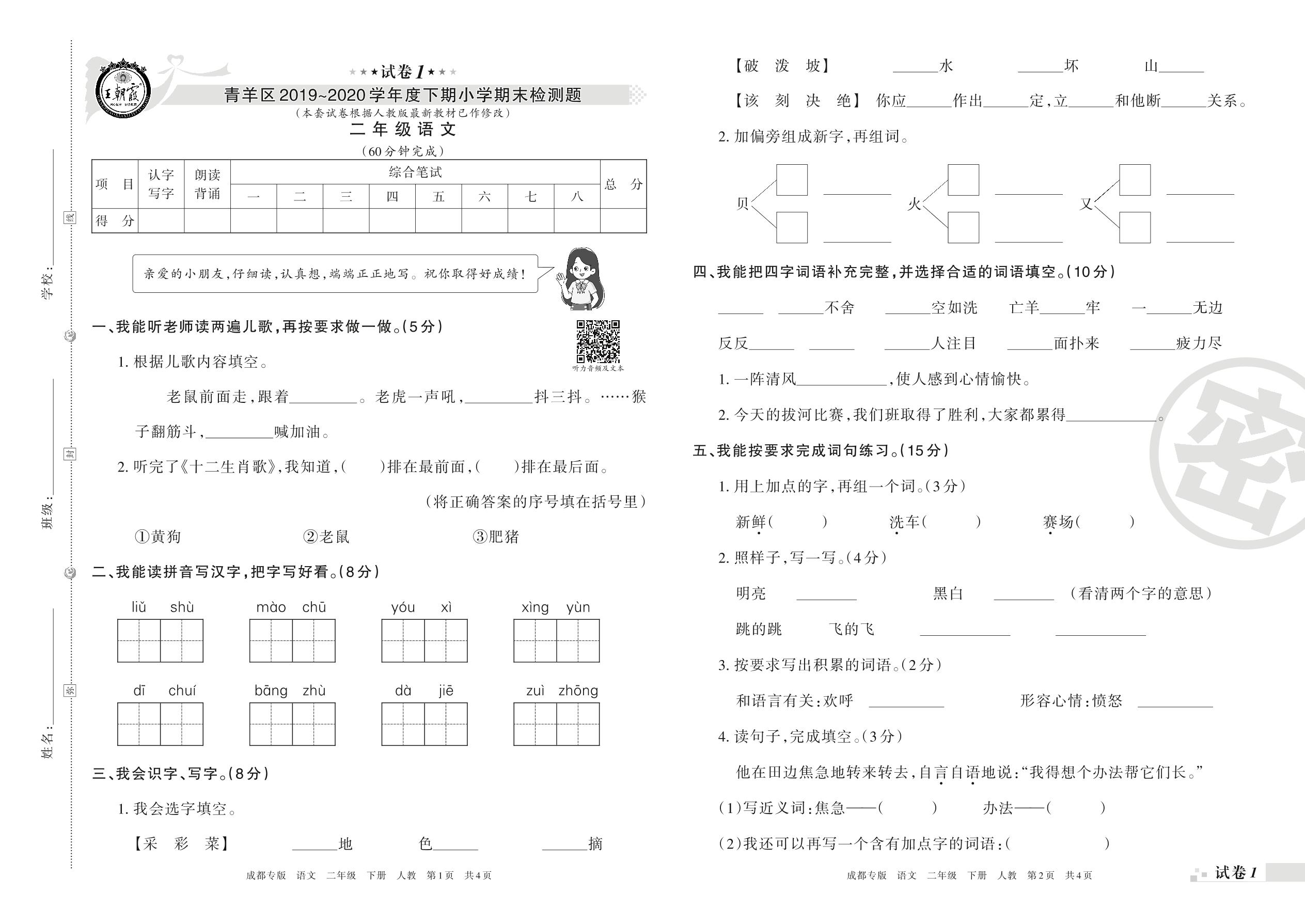 2019-2020学年第二学期成都市青羊区二年级语文试卷(人教版)【1】