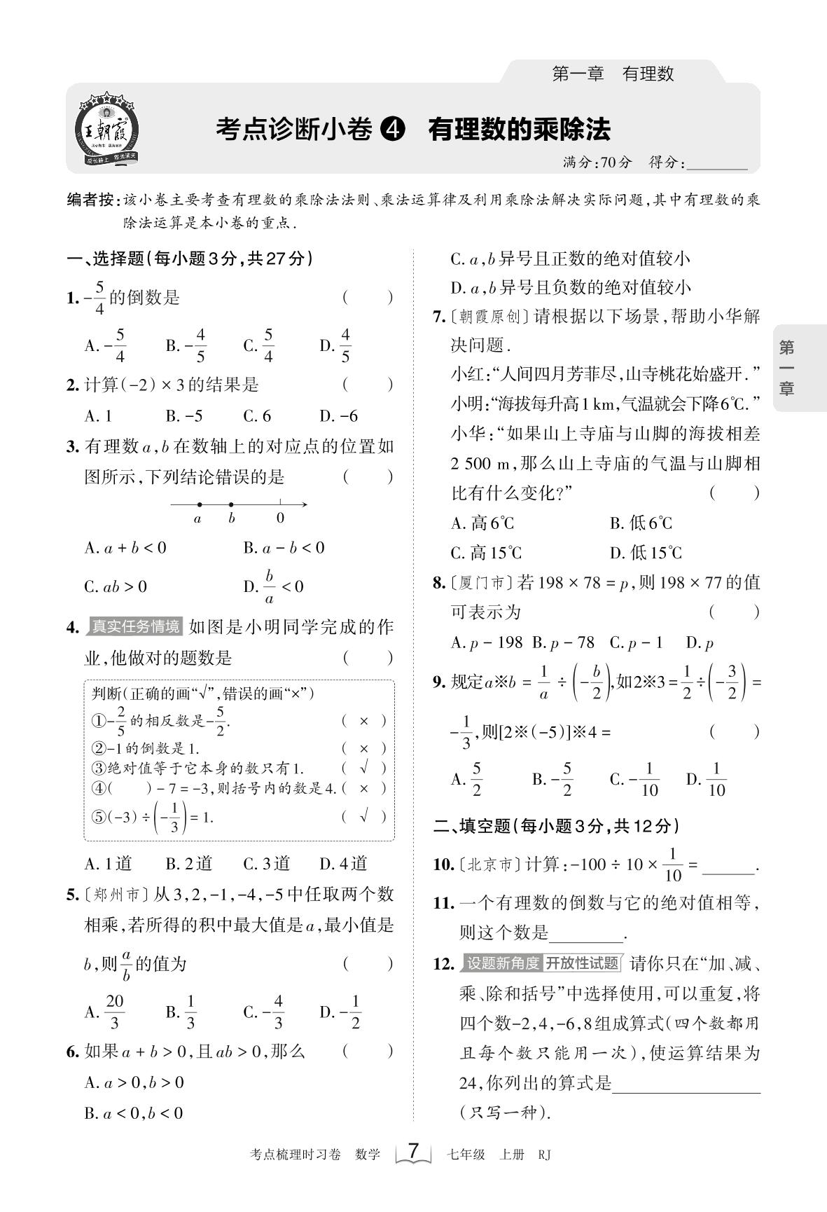 2023上册七年级数学人教版 考点诊断小卷4 有理数的乘除法