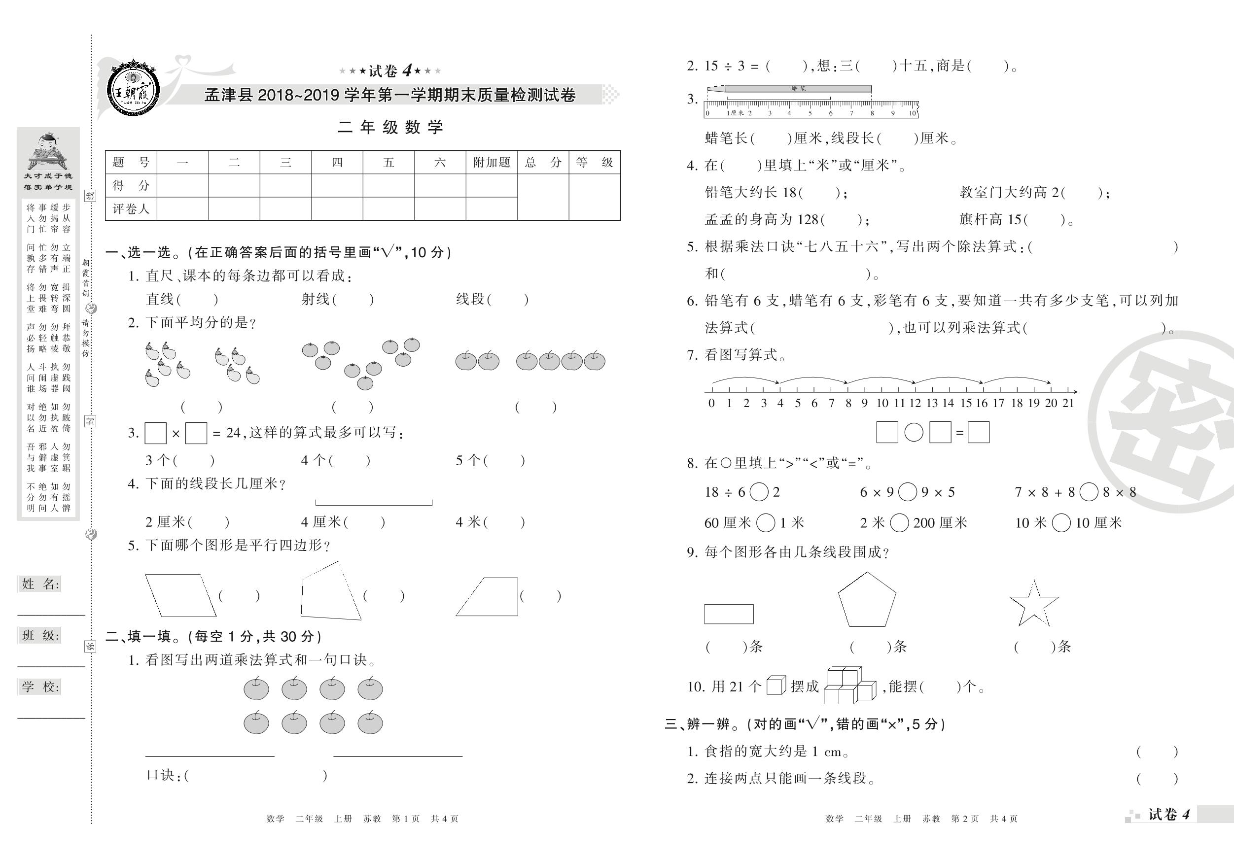 2018-2019学年第一学期洛阳市孟津县二年级数学试卷(苏教版)【4】