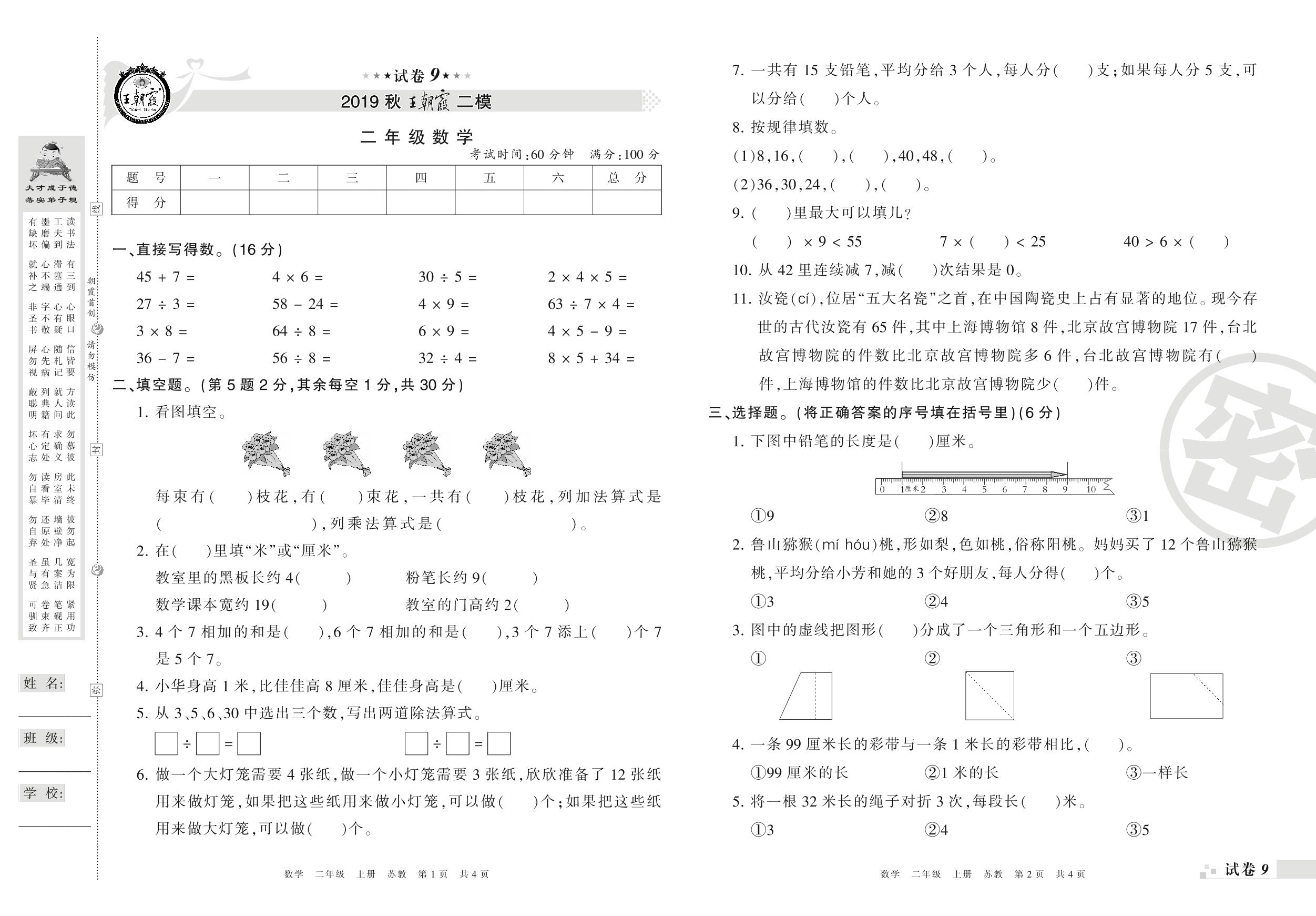 王朝霞期末模拟卷二年级上册数学(苏教版)_R21080393505【9】
