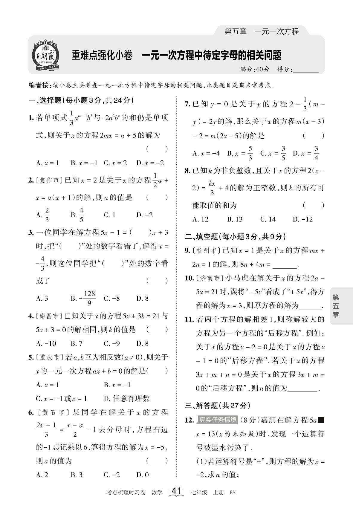 2023上册七年级数学北师版 重点强化小卷 一元一次方程中待定字母的相关问题