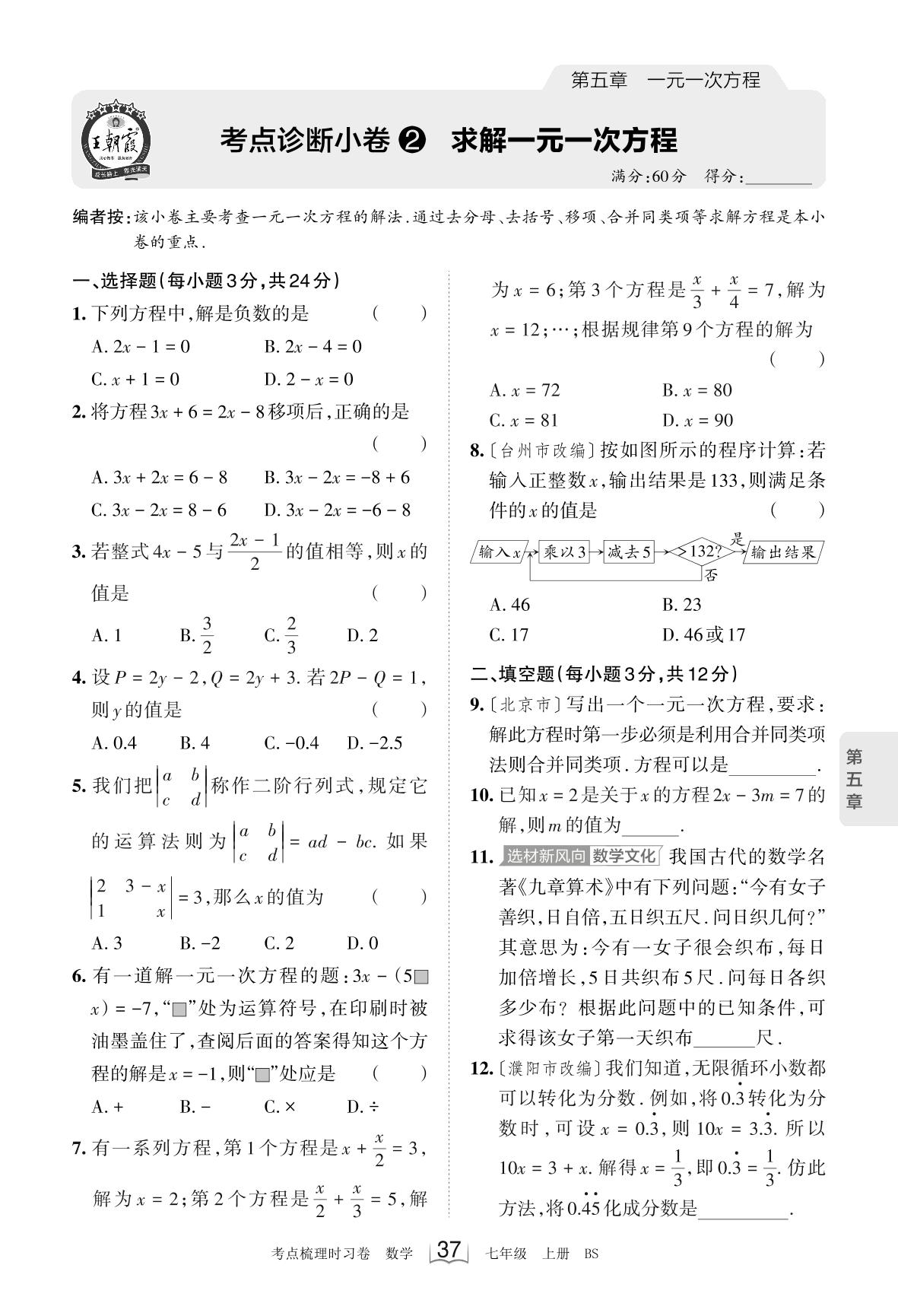 2023上册七年级数学北师版 考点诊断小卷2 求解一元一次方程