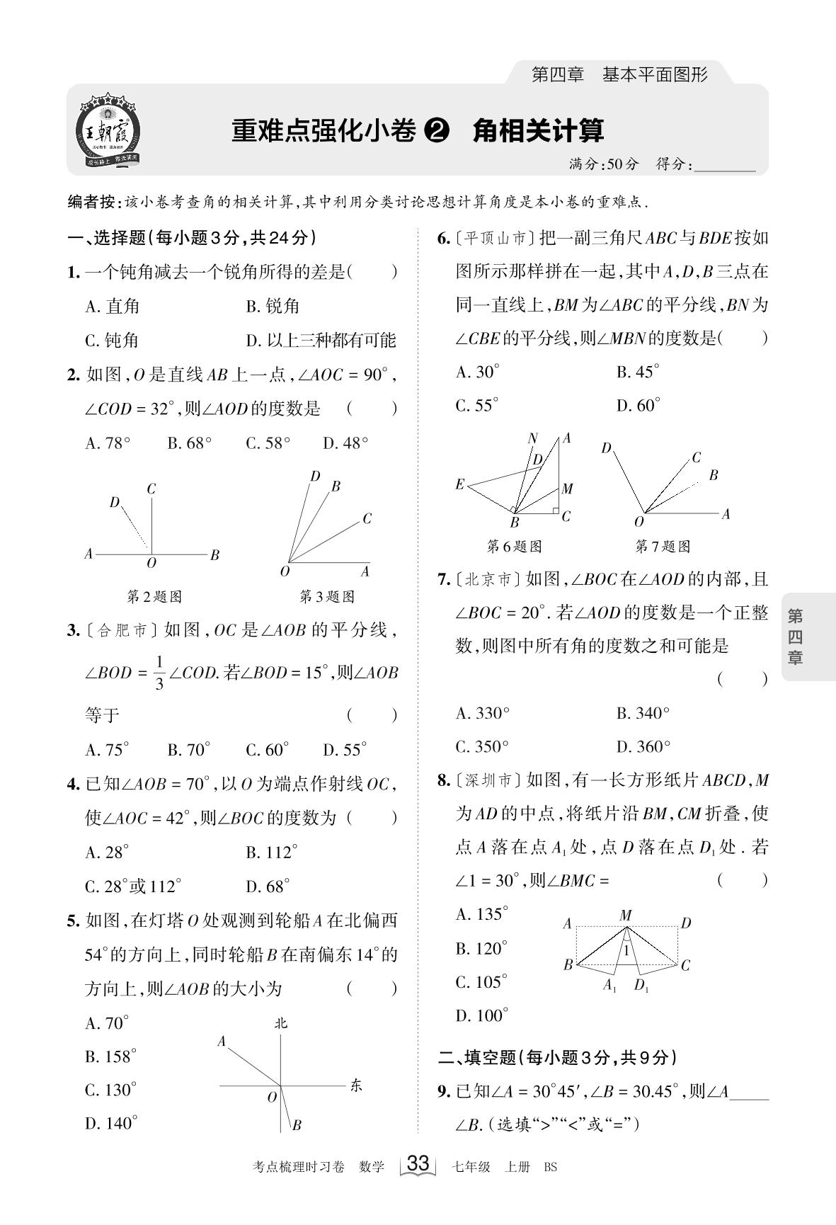 2023上册七年级数学北师版 重点强化小卷2 角相关计算