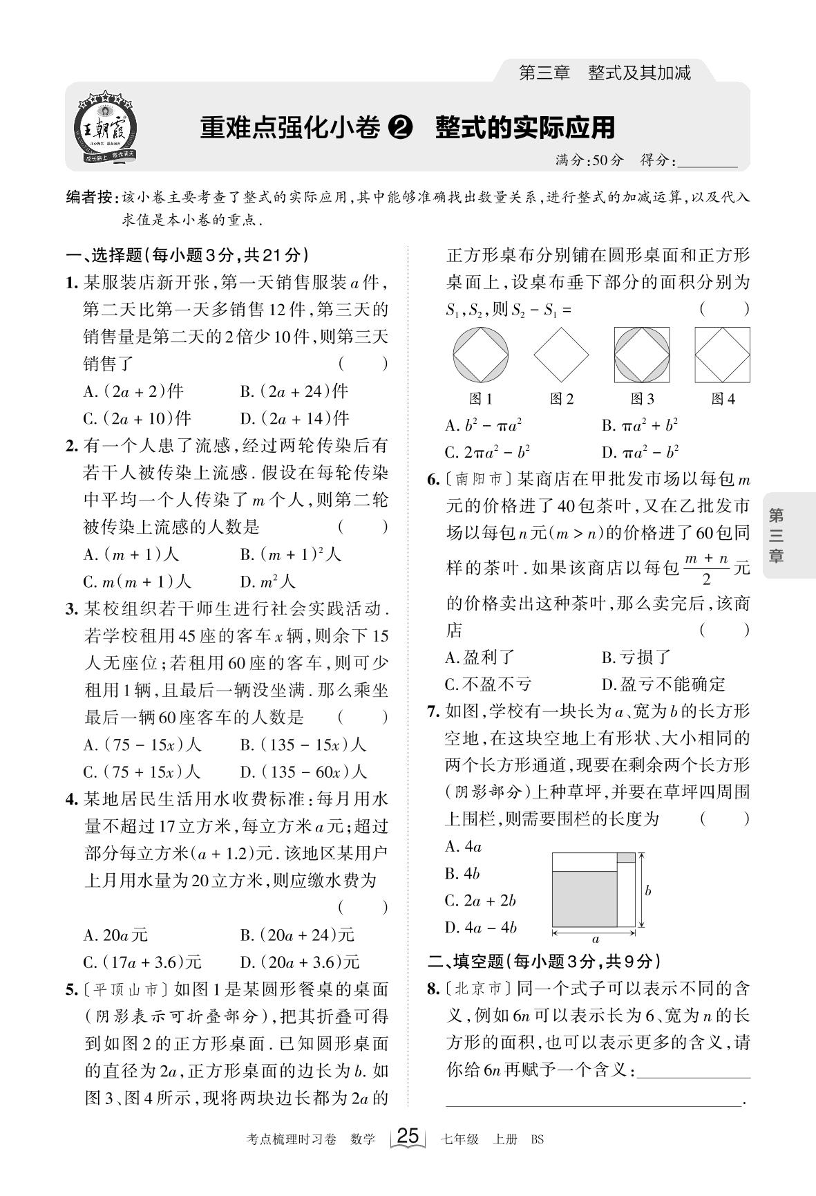 2023上册七年级数学北师版 重点强化小卷2 整式的实际应用